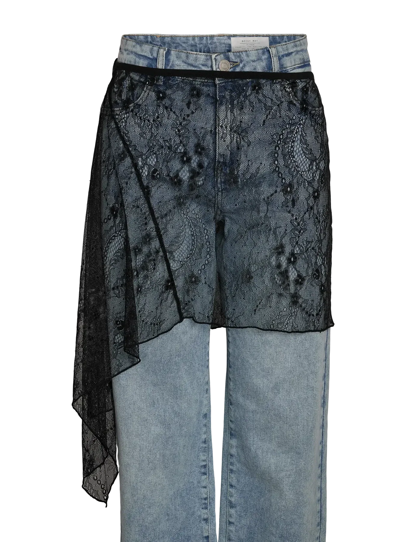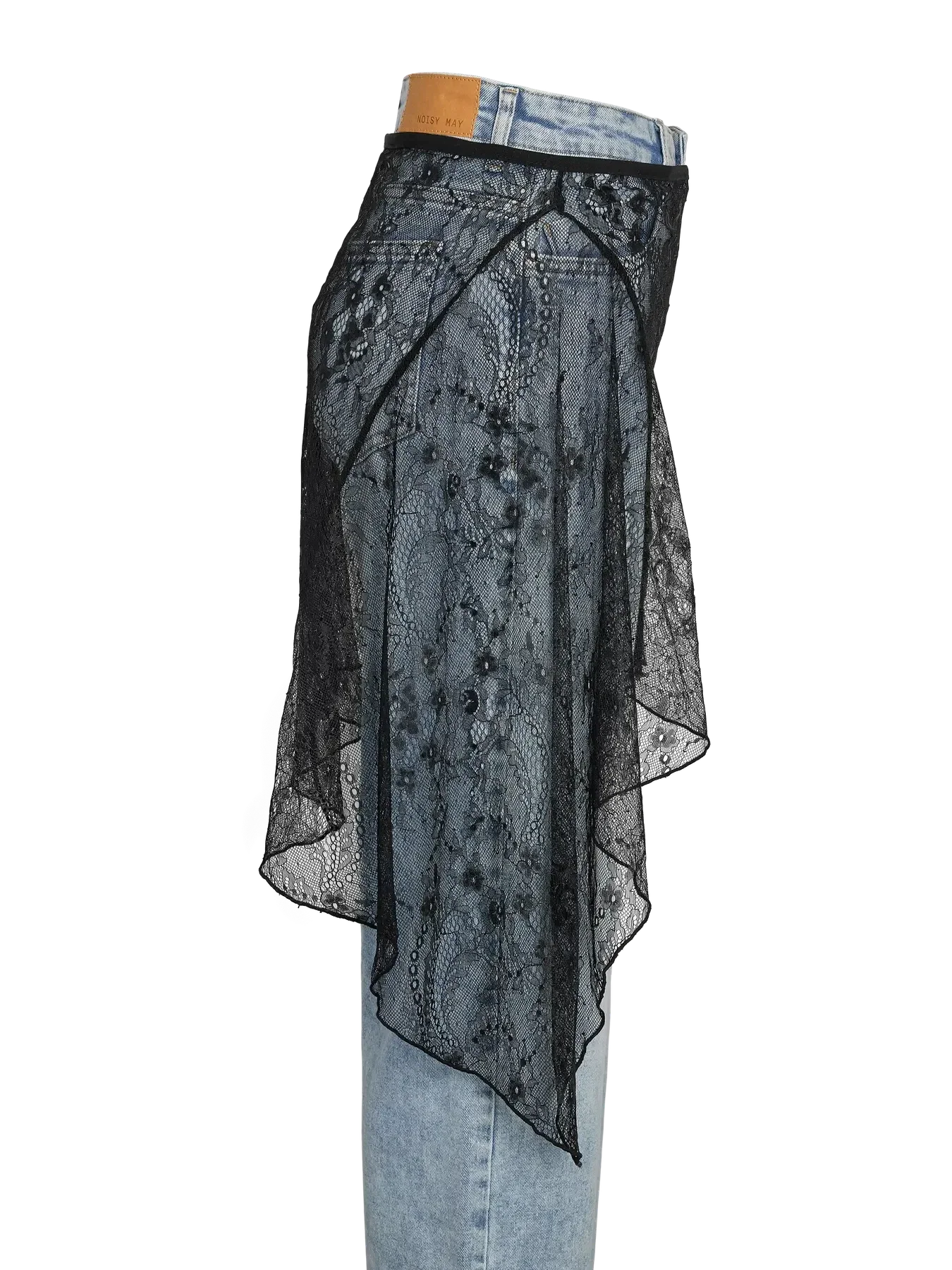 Sort blondeskjørt fra Noisy May, designet for å bæres over jeans eller bukser. Skjørtet har et blomstrete blondemønster og en asymmetrisk kant.