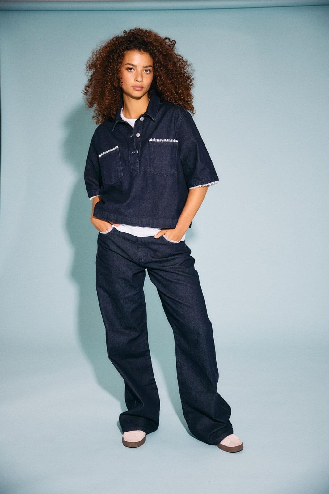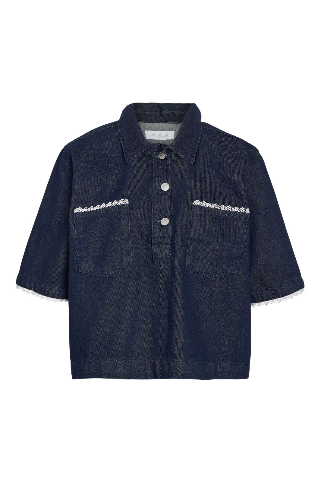 Mørkeblå denimskjorte fra Noisy May med polokrage og 3/4-ermer. Skjorten har blondedetaljer langs lommene og knapper foran.