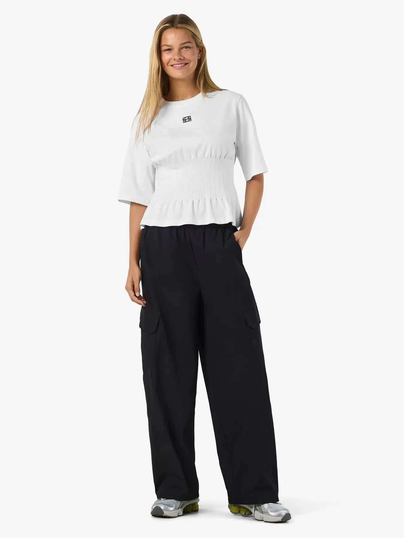 Hvit fitted T-skjorte fra Noisy May med logo på brystet. T-skjorten har en skjæringslinje i midjen med volanger.