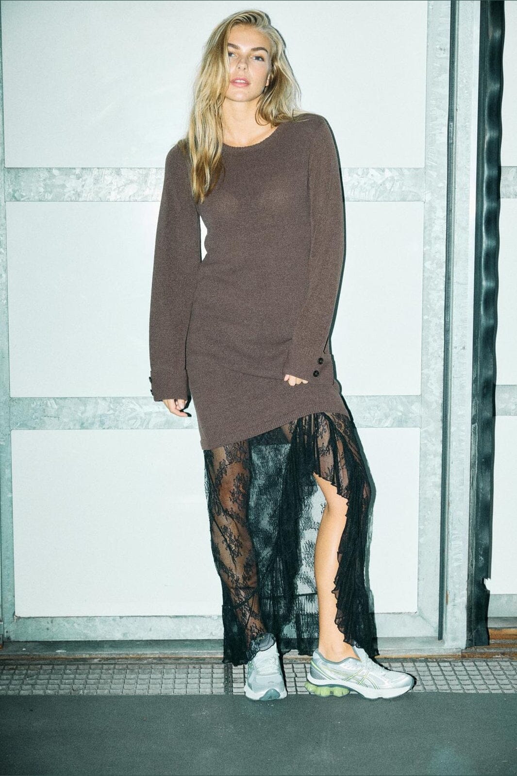 Svart lang skjørt fra Noisy May med gjennomsiktig blondeoverflate og blomstermønster. Skjørtet har asymmetriske volanger og en elastisk midje uten lukking.