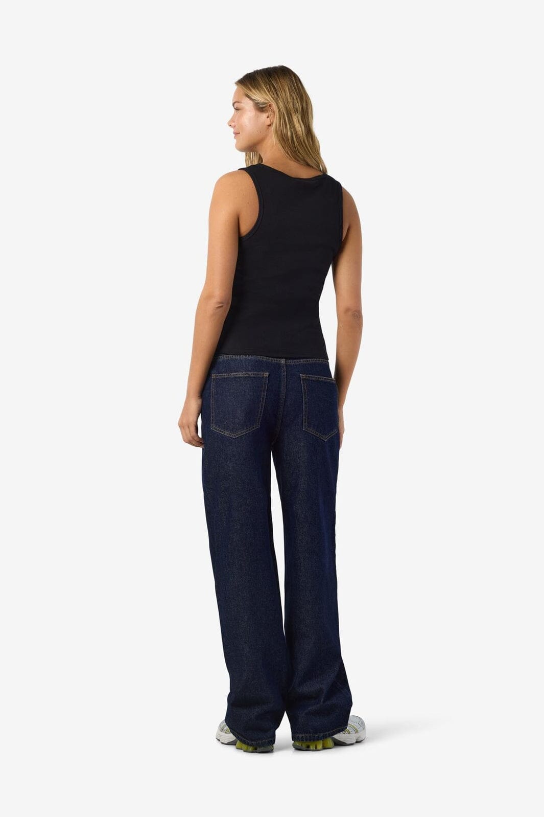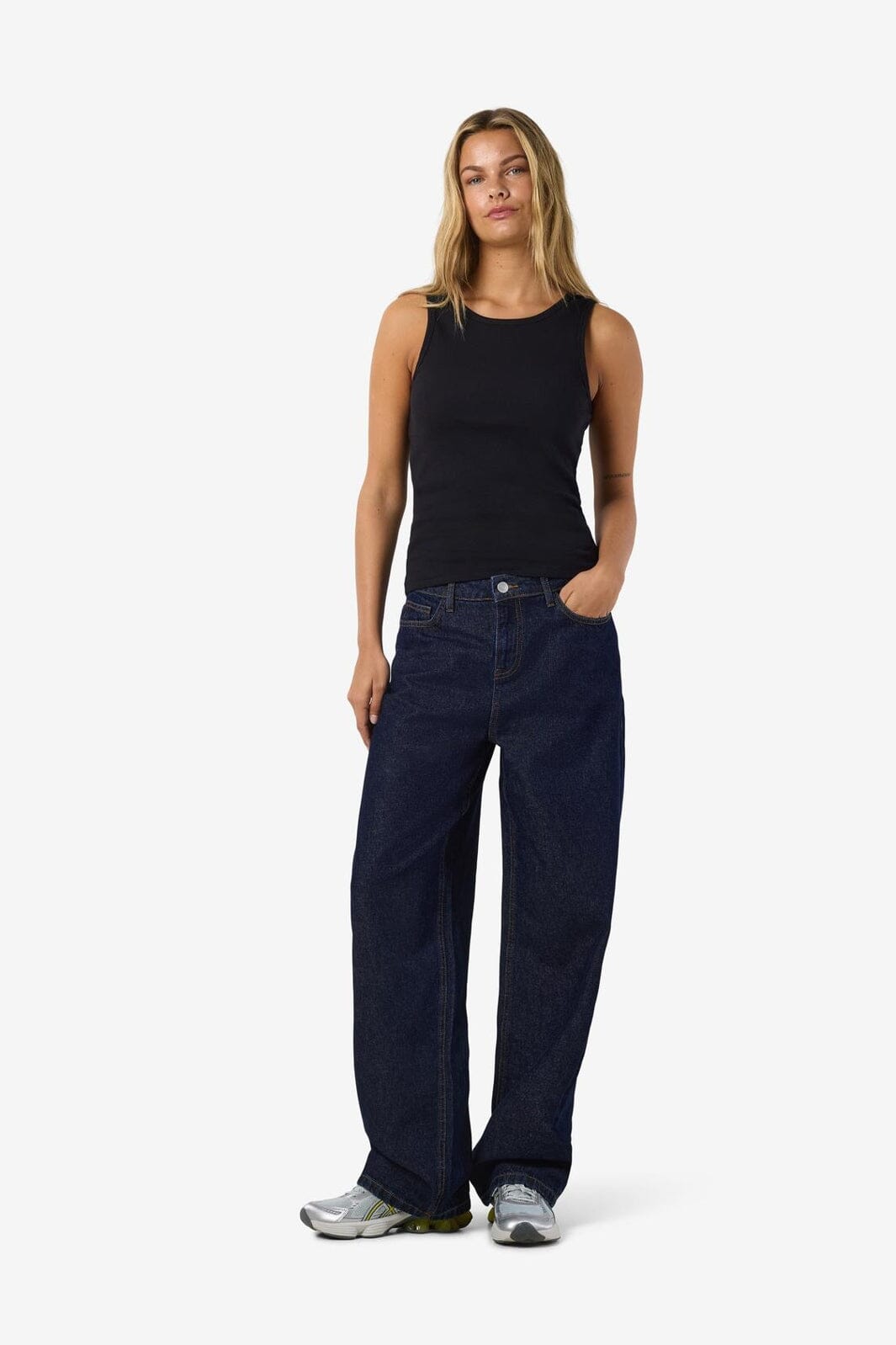 Svart tanktop fra Noisy May med rund halsutskjæring og brede skulderstropper. Den tettsittende passformen fremhever kroppens linjer.
