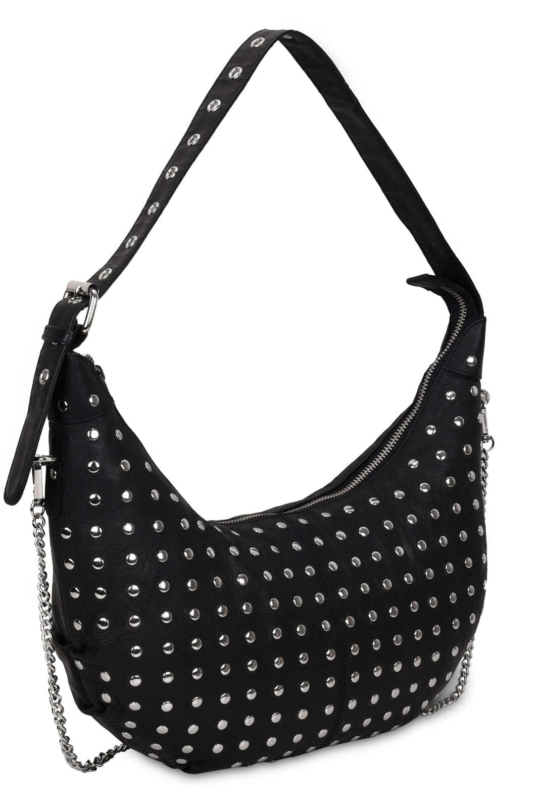 Sort skinnveske fra Núnoo med sølvfargede nagler. Vesken har en buet form og er utstyrt med glidelås samt en innvendig lomme med glidelås.