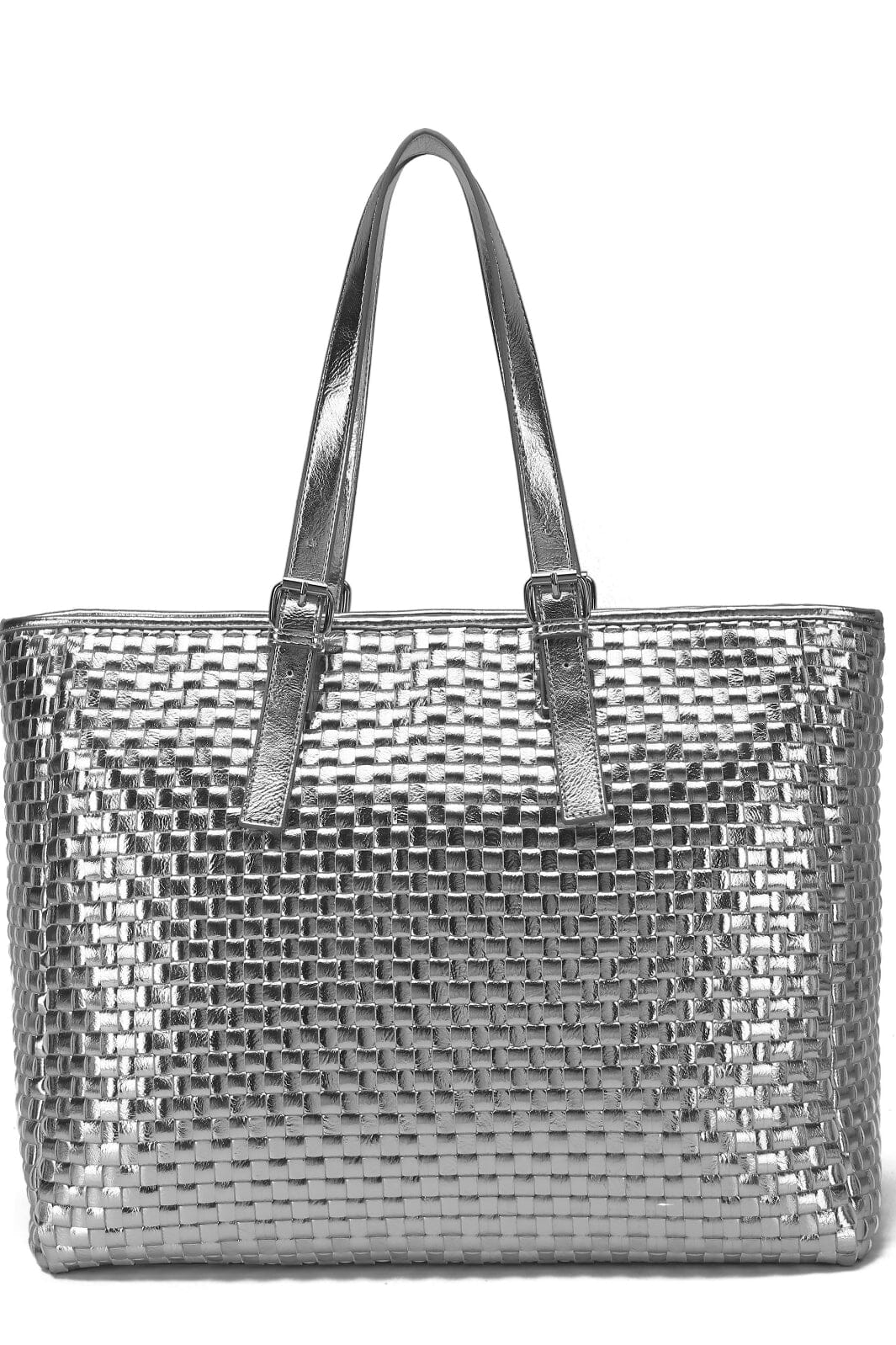 Sølvfarget maxi shopper fra Núnoo med et flettet design. Vesken er laget av resirkulerte materialer og har et håndlaget uttrykk med sine flettede detaljer.