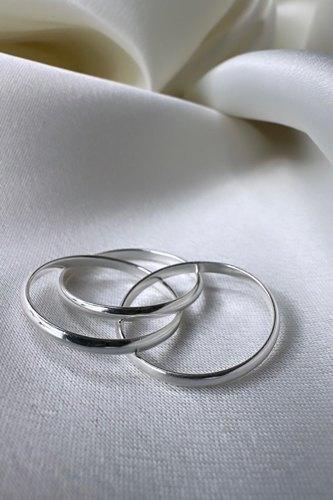 Forsølvde ringer fra O element med tre sammenkoblede ringer. Ringen er laget av messing med en blank sølvoverflate som skaper et rent og minimalistisk design.