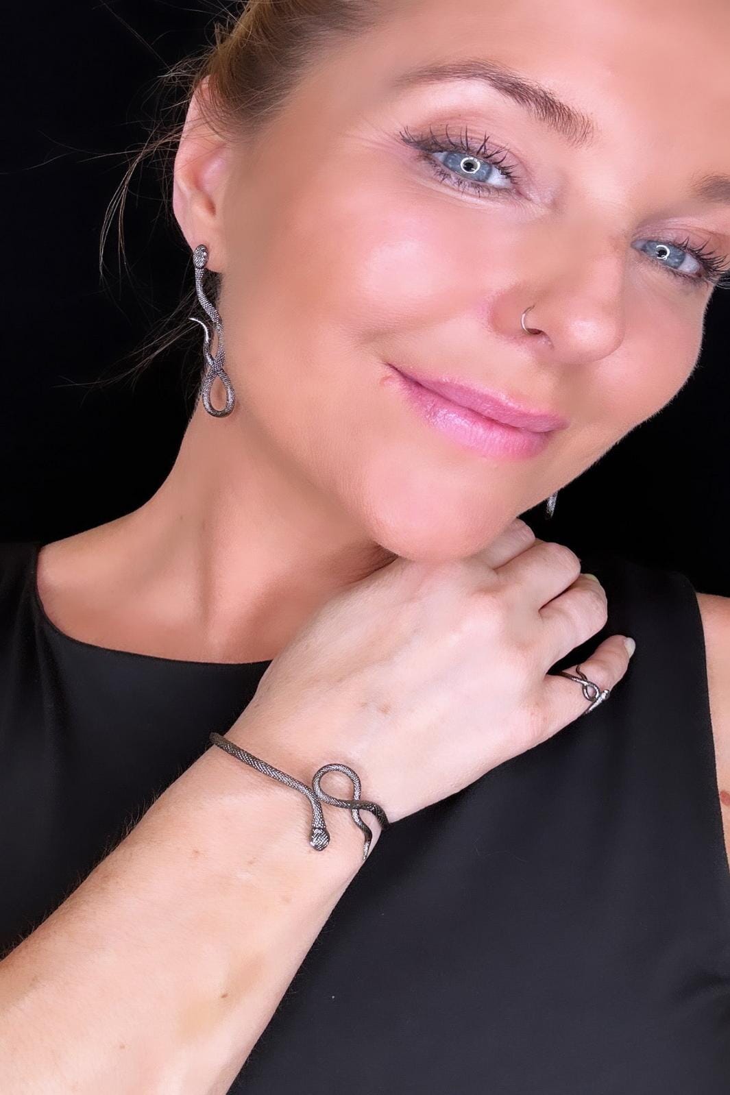Sorte øredobber fra O Element i messing. Øredobbene har et slangeformet design med CZ-øyne og en detaljert overflate med skjellmønster.