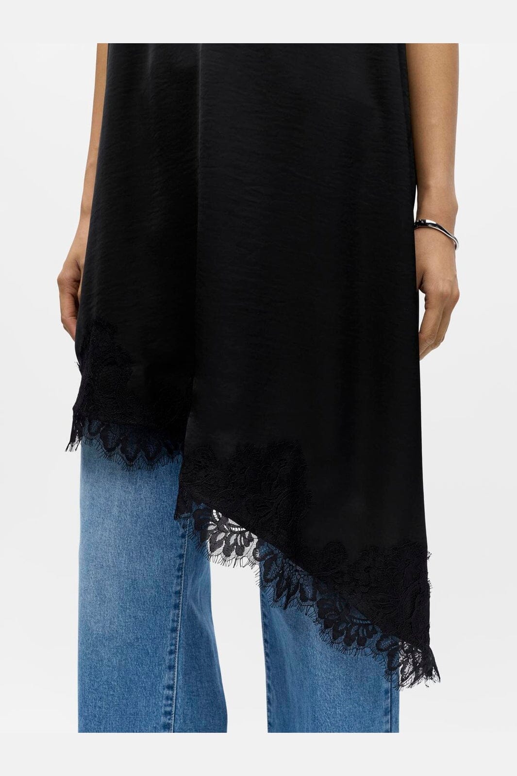 Svart kjole fra Object med blonde detaljer. Kjolen har tynne stropper og en V-utringning. Den asymmetriske kanten og blondekanten gir kjolen et unikt uttrykk.