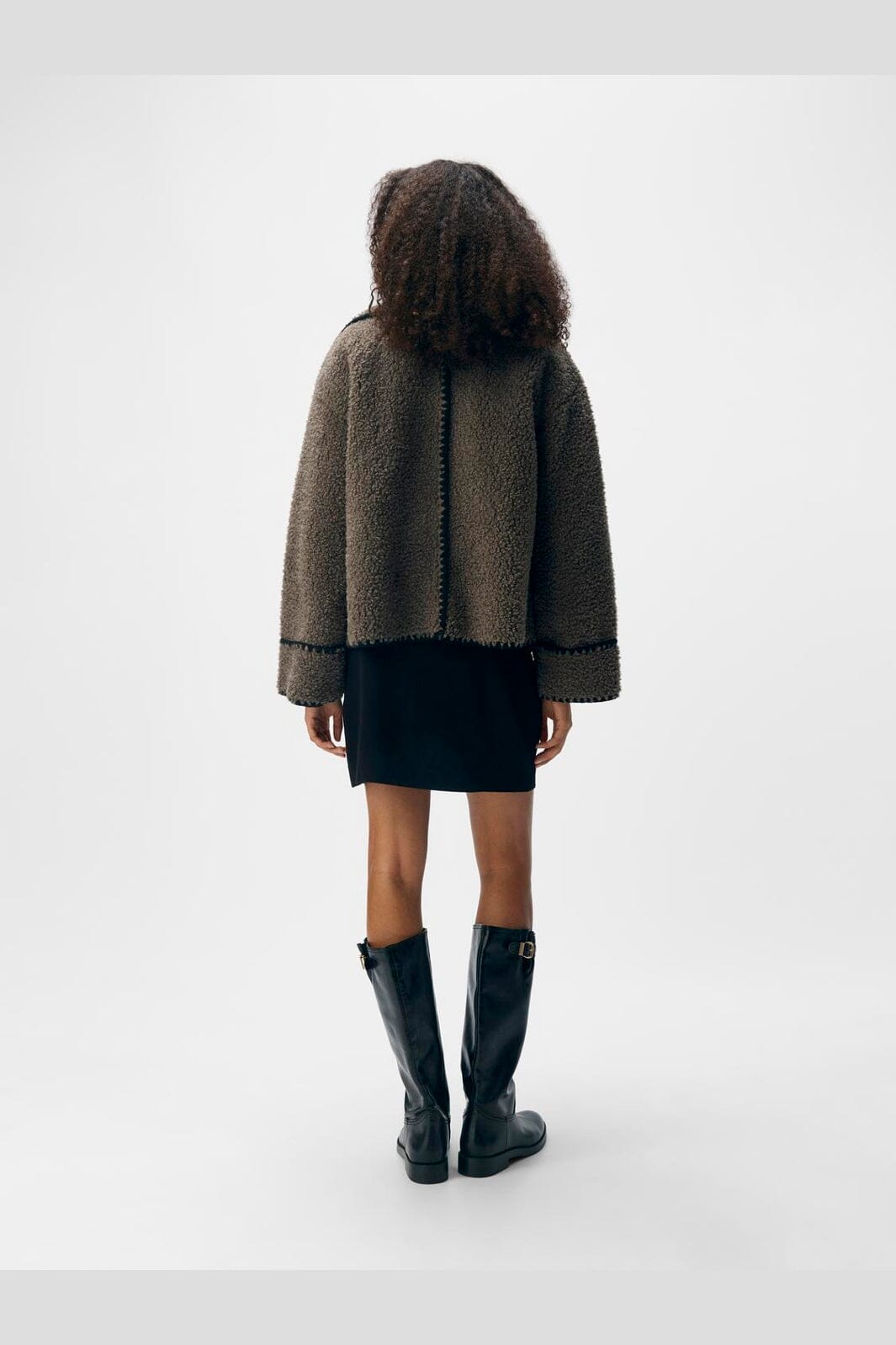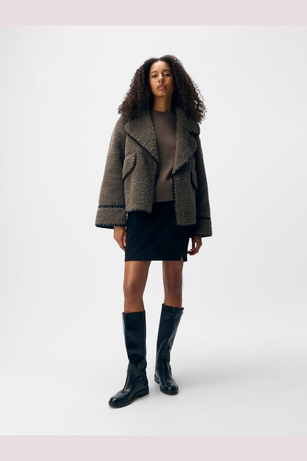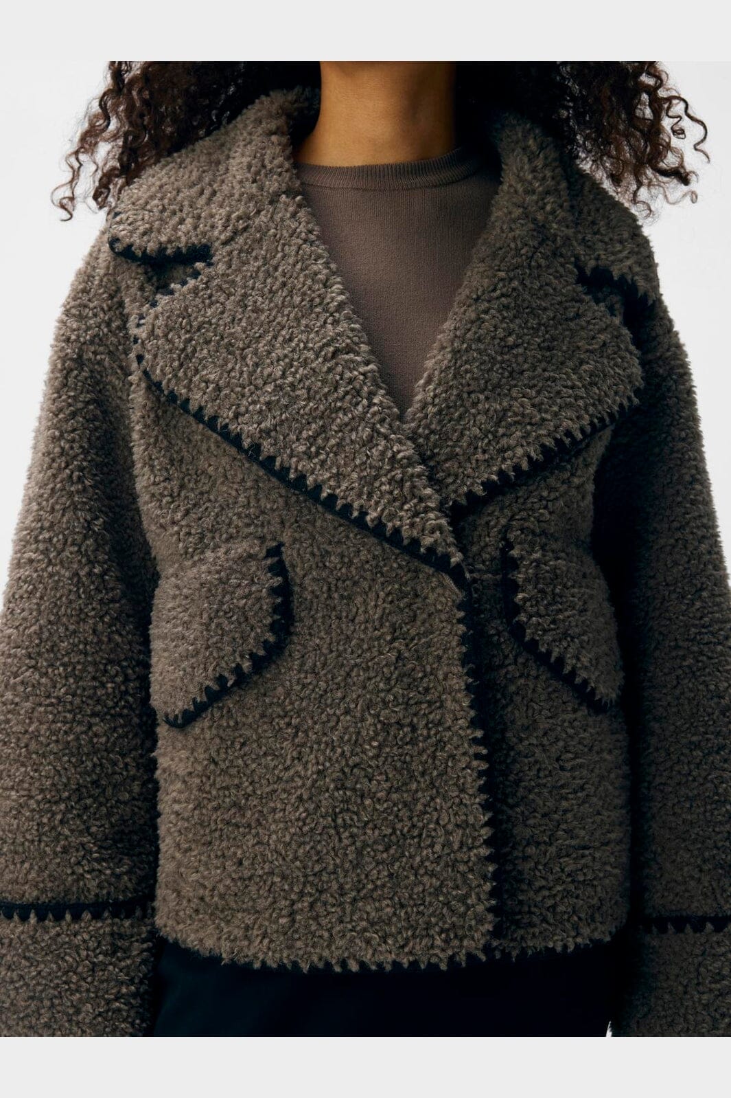 Brun teddyjakke fra Object med stor krage og dekorative sømmer. Jakken har en plysset tekstur og lange ermer med senkede skuldersømmer.