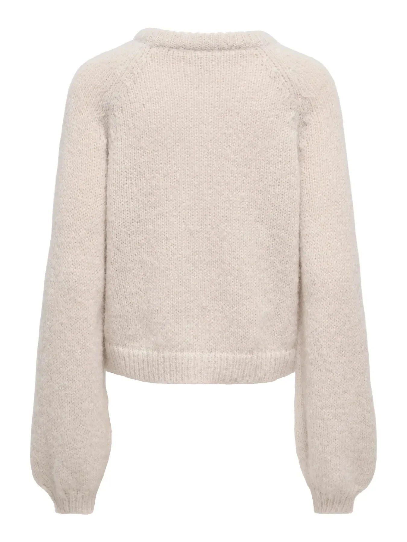 En cardigan fra Only i en lys beige farge. Cardiganen er laget av 100 % resirkulert polyester og har lange raglanermer med knepping foran.