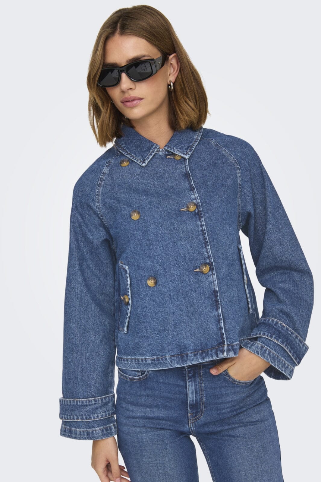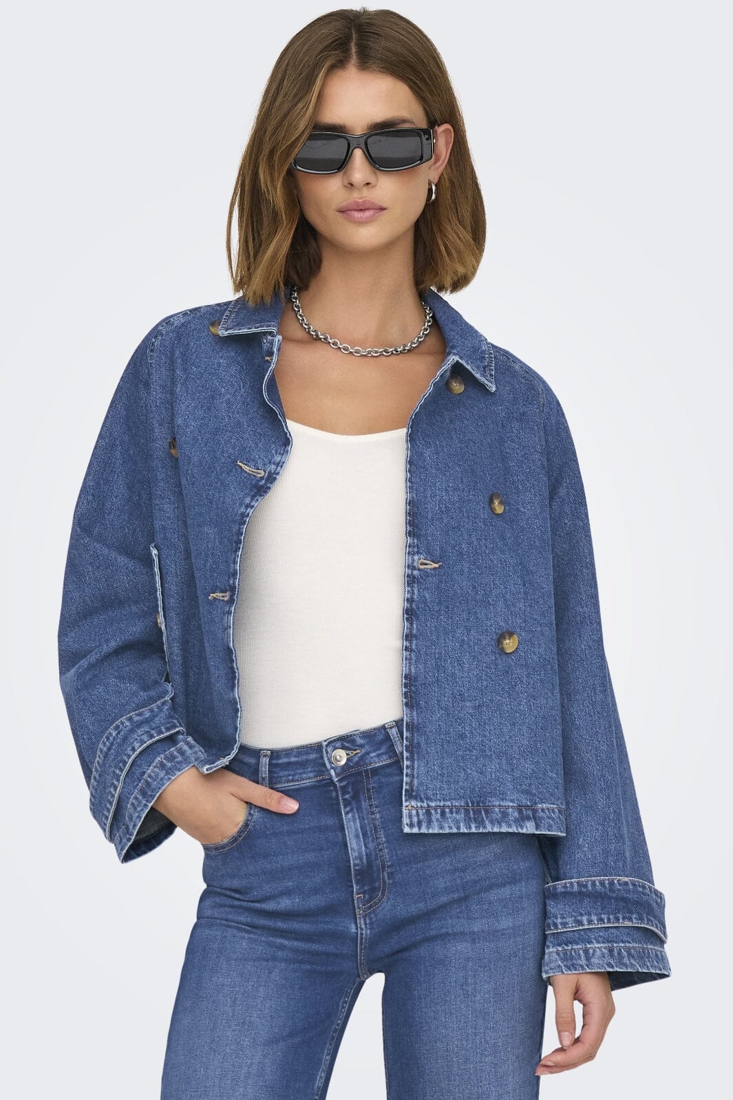 Kort trenchcoat i denim fra Only med skjortekrage og dobbeltknapplukking. Jakken har dekorative sømmer og praktiske lommer med knapplukking foran.