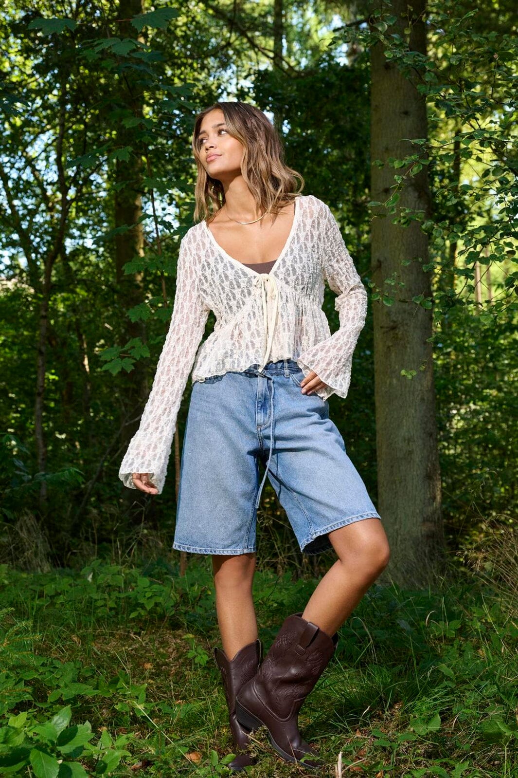 Kremfarget blondecardigan fra Only med V-hals og lange ermer. Cardiganen har knytebånd foran og blondedetaljer over hele overflaten.