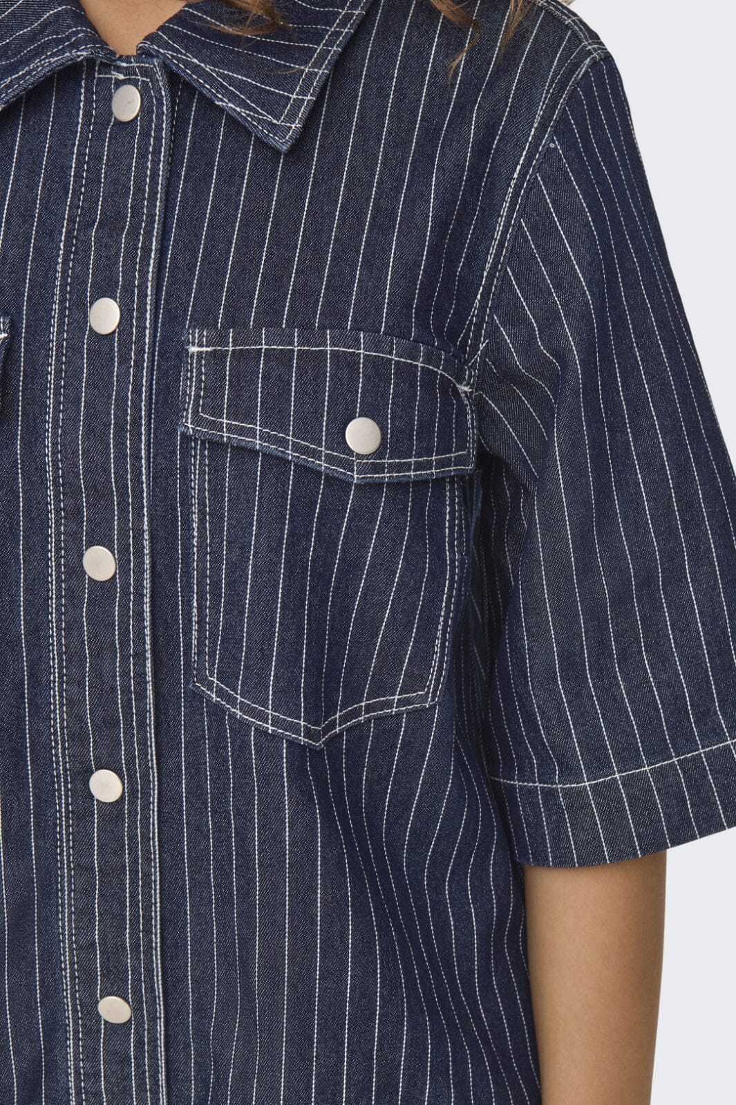 Stripet denimkjole fra Only med skjortekrage og knapplukking. Den mørkeblå kjolen har praktiske brystlommer og korte ermer som gir et avslappet uttrykk.