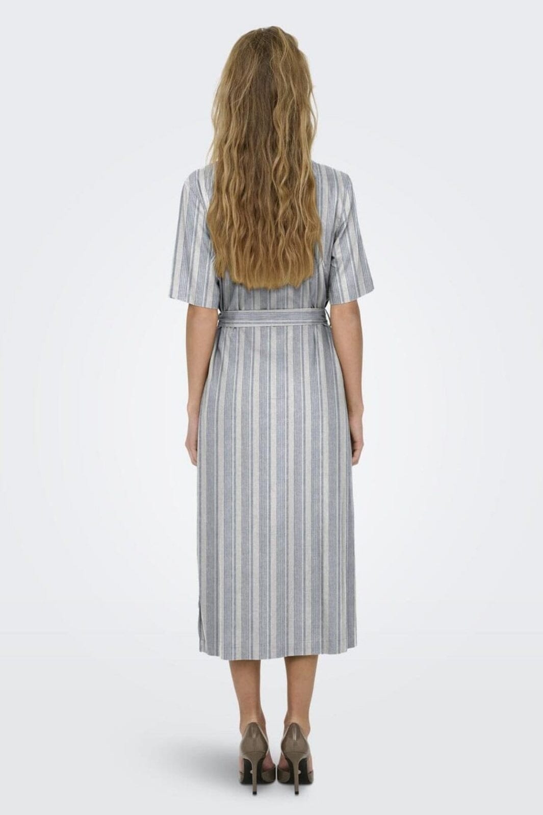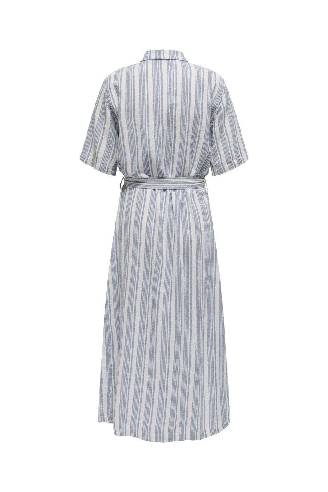 Stripet skjortekjole fra Only i blått og hvitt. Kjolen har skjortekrage, korte ermer og knapplukking hele veien ned. Et belte i midjen gir mulighet for å justere passformen.