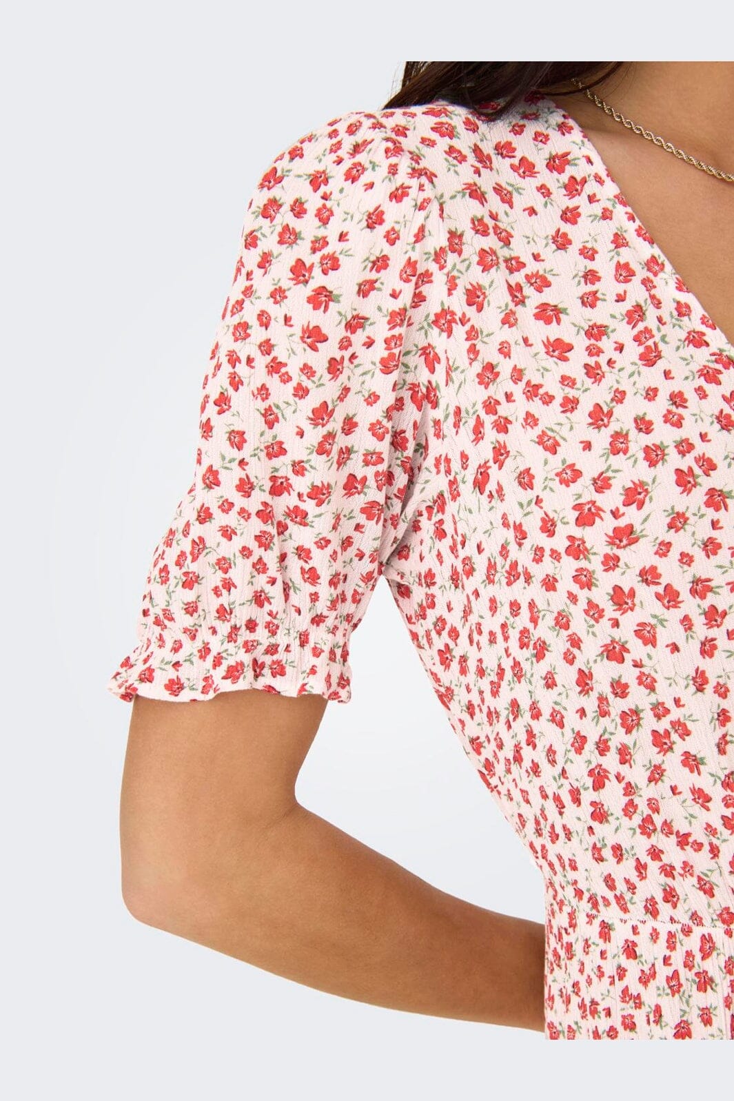 Lang kjole fra Only i 100% viskose Lenzing™ Ecovero™. Kjolen har et rødt blomstermønster på hvit bakgrunn.