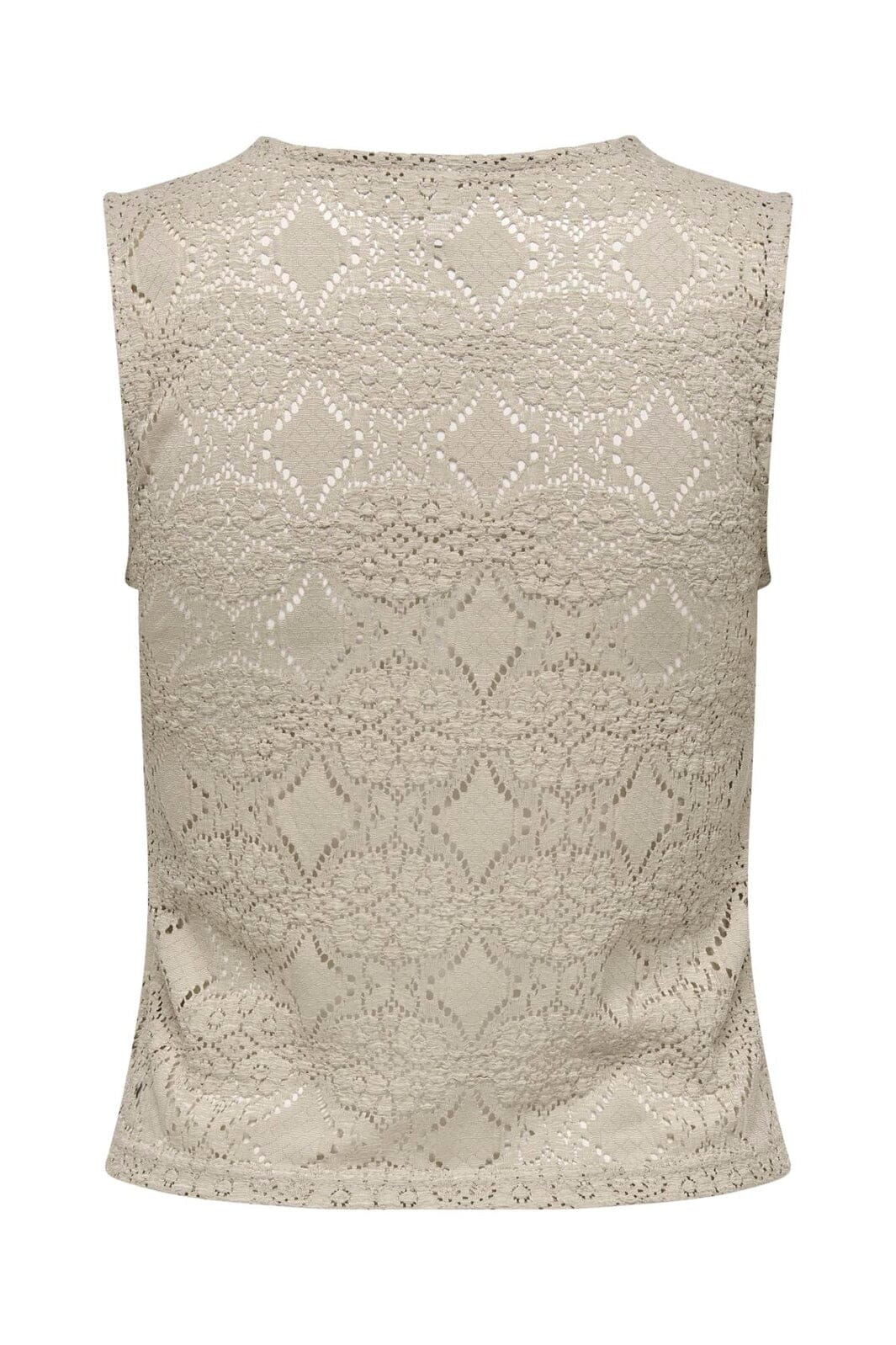 En ermeløs topp fra Only i en beige nyanse. Toppen har et blondemønster over hele overflaten og en rund halsutringning.