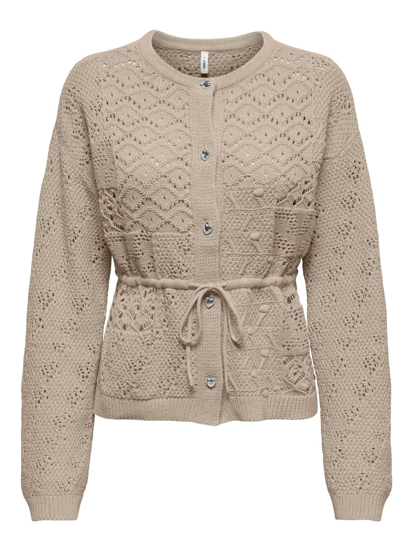 En beige cardigan fra Only med hjerteformede sølvknapper. Cardiganen er laget av 70 % resirkulert bomull og 30 % resirkulert polyester i en åpenstrikket struktur.