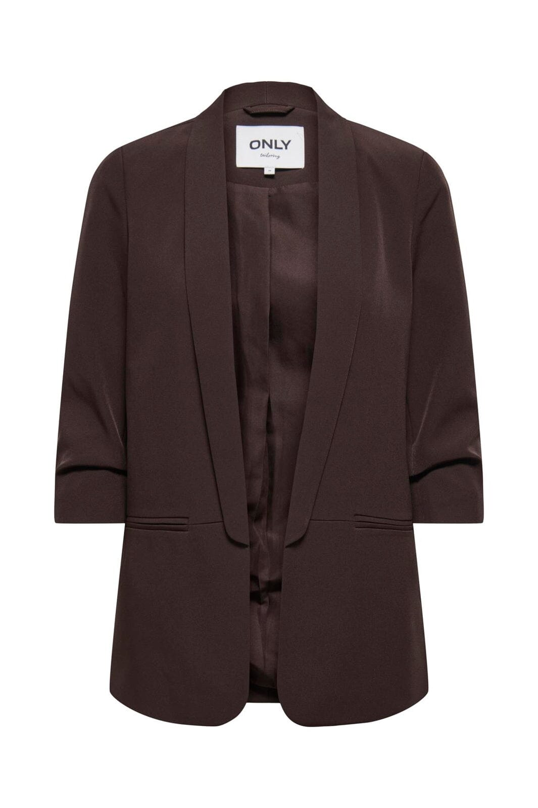 Brun blazer fra Only med trekvartlange ermer og revers halsutskjæring. Den åpne fronten uten knapper og de to frontlommene gir blazeren et rent og enkelt uttrykk.