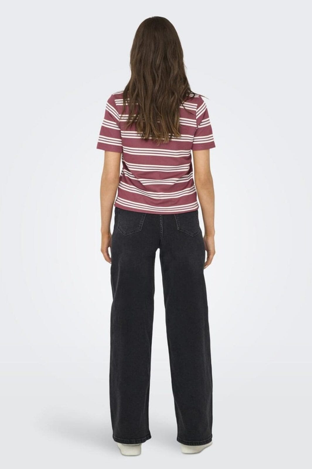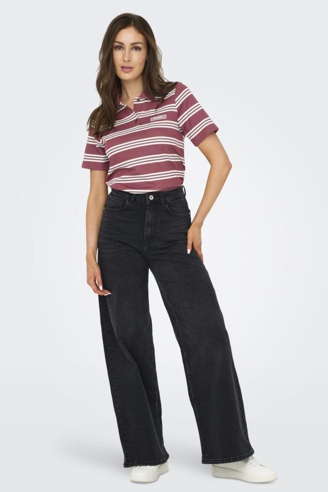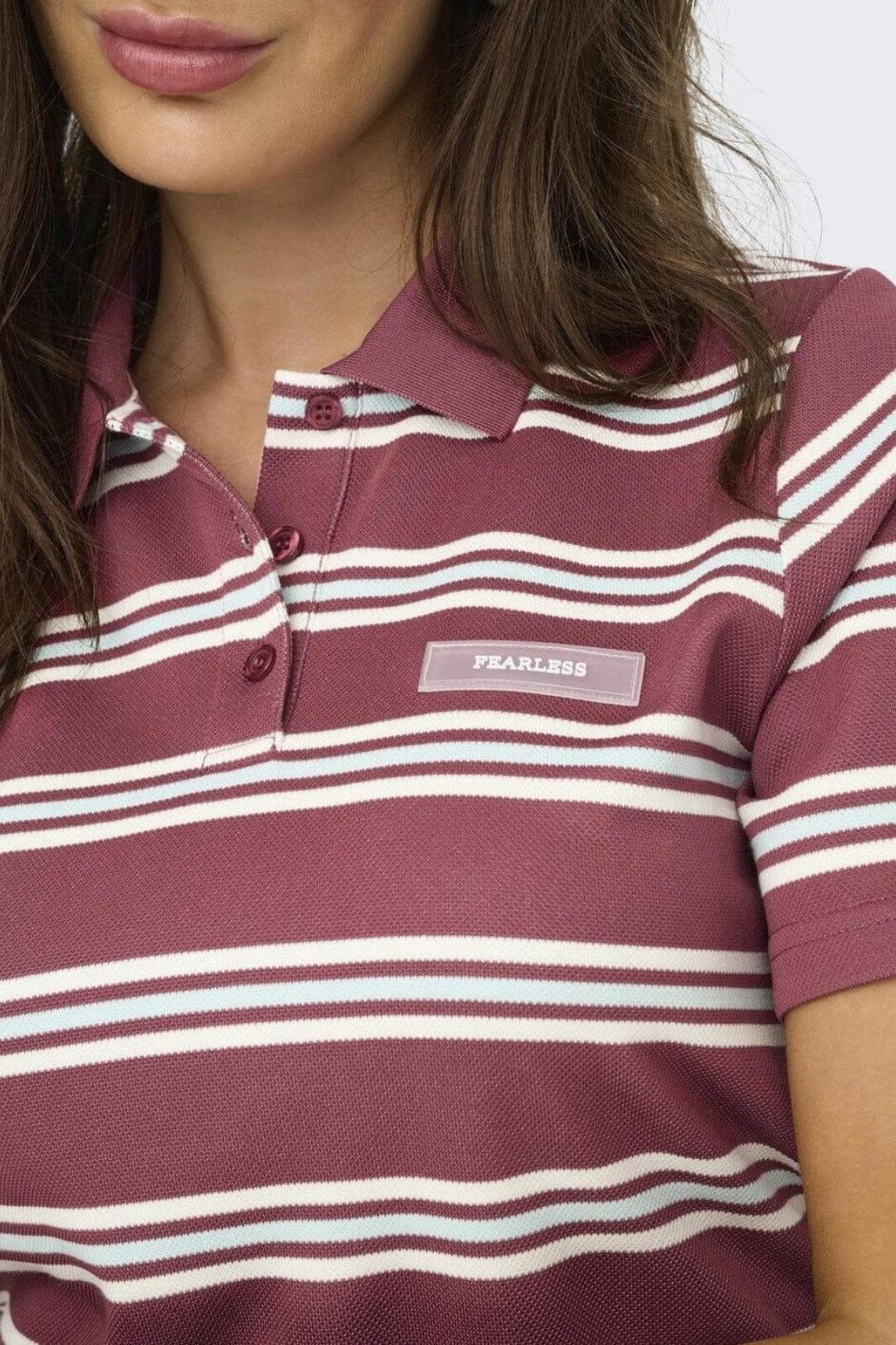 /Randete polo-top fra Only med et design i vinrød, lyseblå og hvite striper. Toppen har en klassisk polokrage og knapper foran.