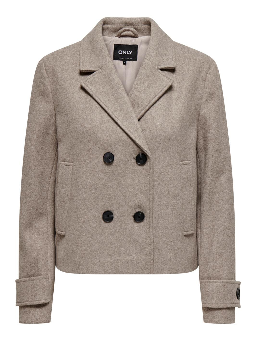 Kort jakke fra Only i mocha meringue melange. Den dobbeltknappede modellen har skjortekrage og korte ermer med stropdetaljer.