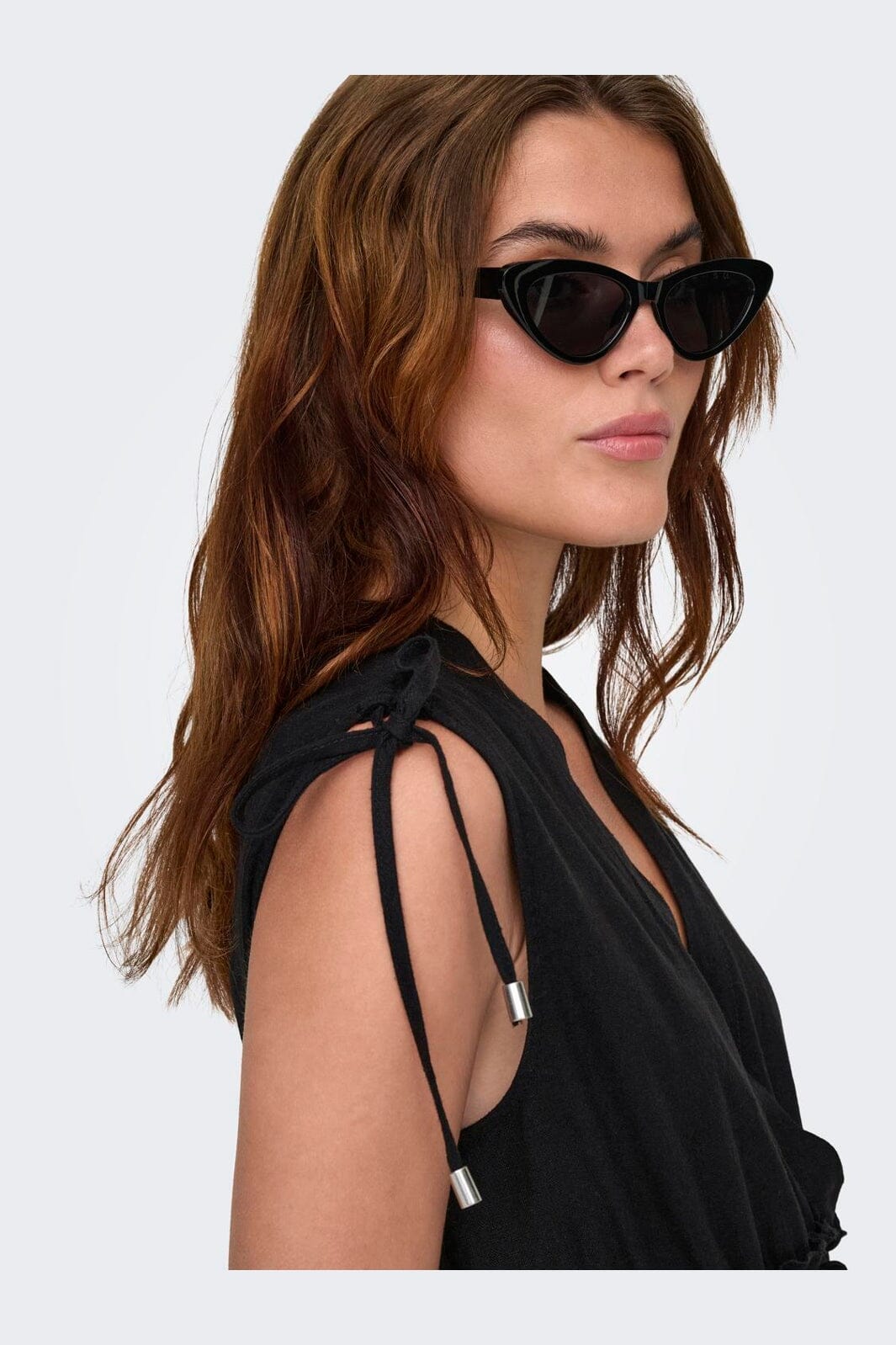 Lang svart kjole fra Only, laget av en blanding av viskose og lin. Kjolen har V-hals, er ermeløs og har snor i midjen.