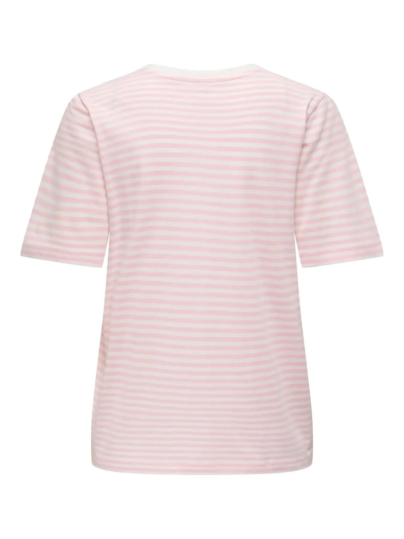 Stribet T-skjorte fra Only i rosa og hvitt. Laget av 100 % økologisk bomull med en liten kirsebærbroderi på brystet.