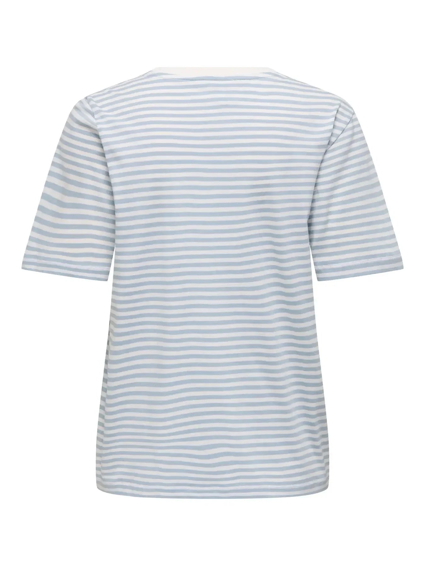 Stribet t-skjorte fra Only i lyseblå og hvite striper med et lite kirsebærmotiv brodert på forsiden.