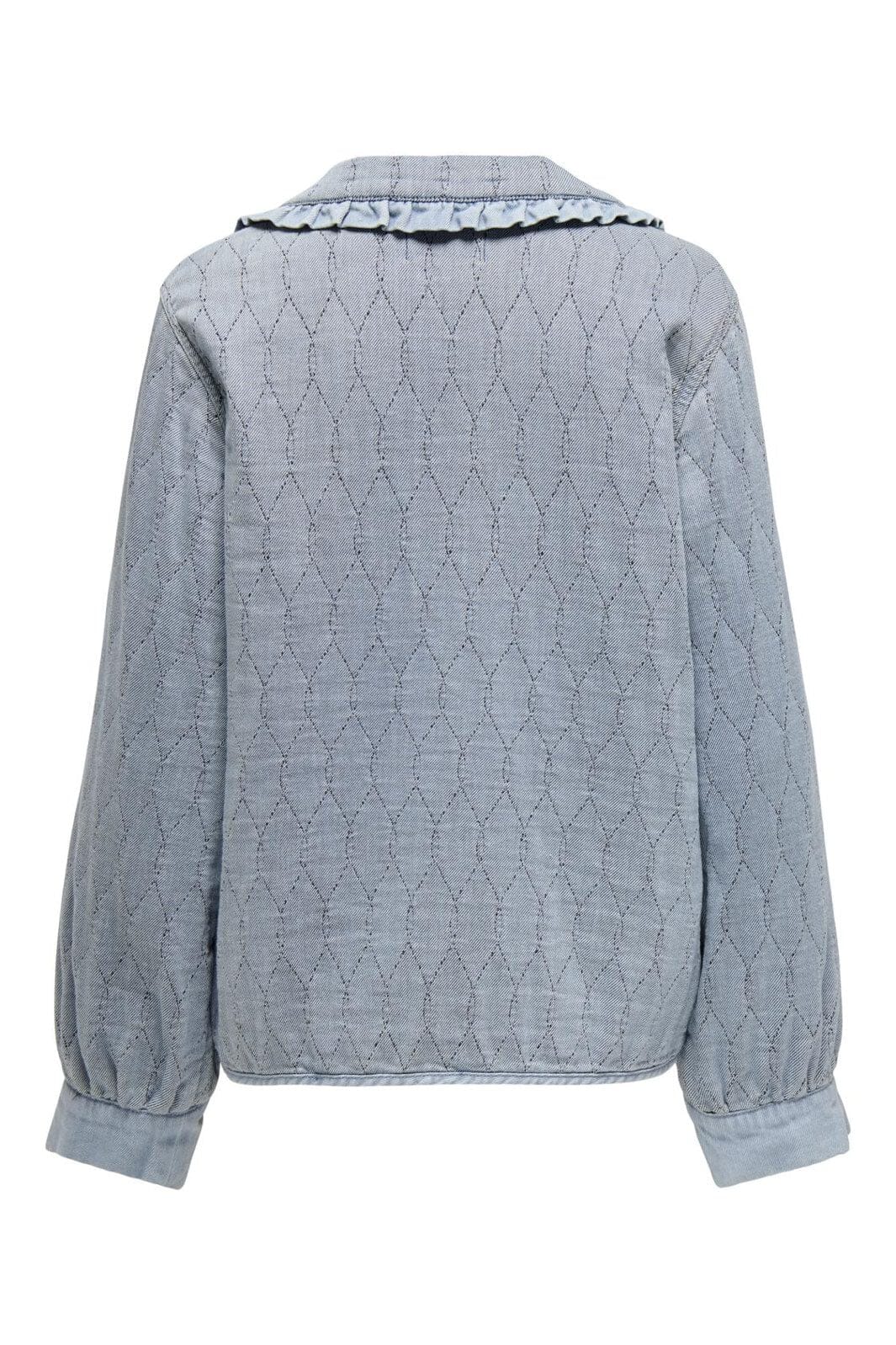 Lys blå denimskjorte fra Only med volangkrage og båndlukking. Skjorten har dekorative sømmer, to forlommer og elastiske mansjetter med kantbånd.