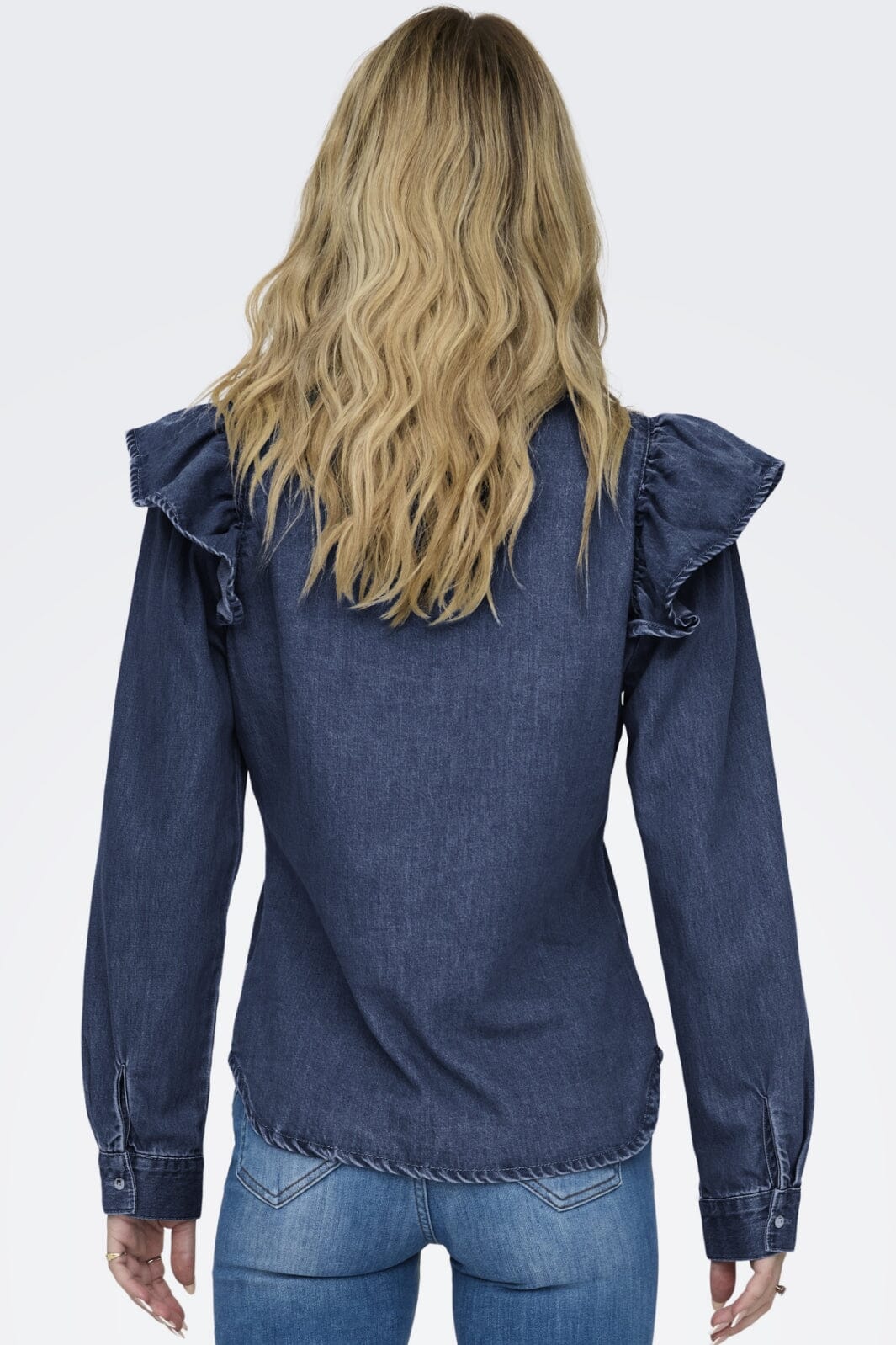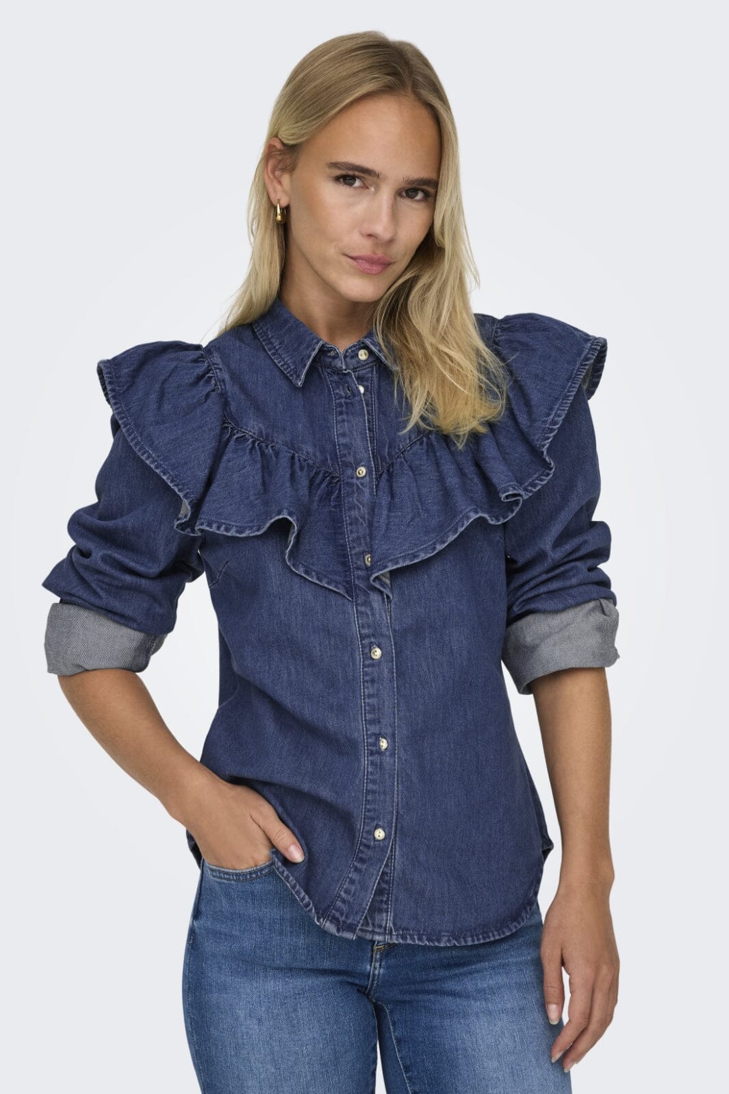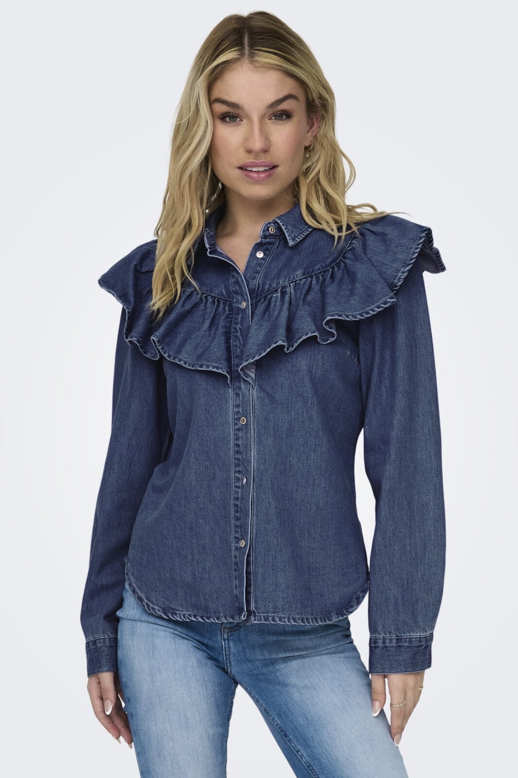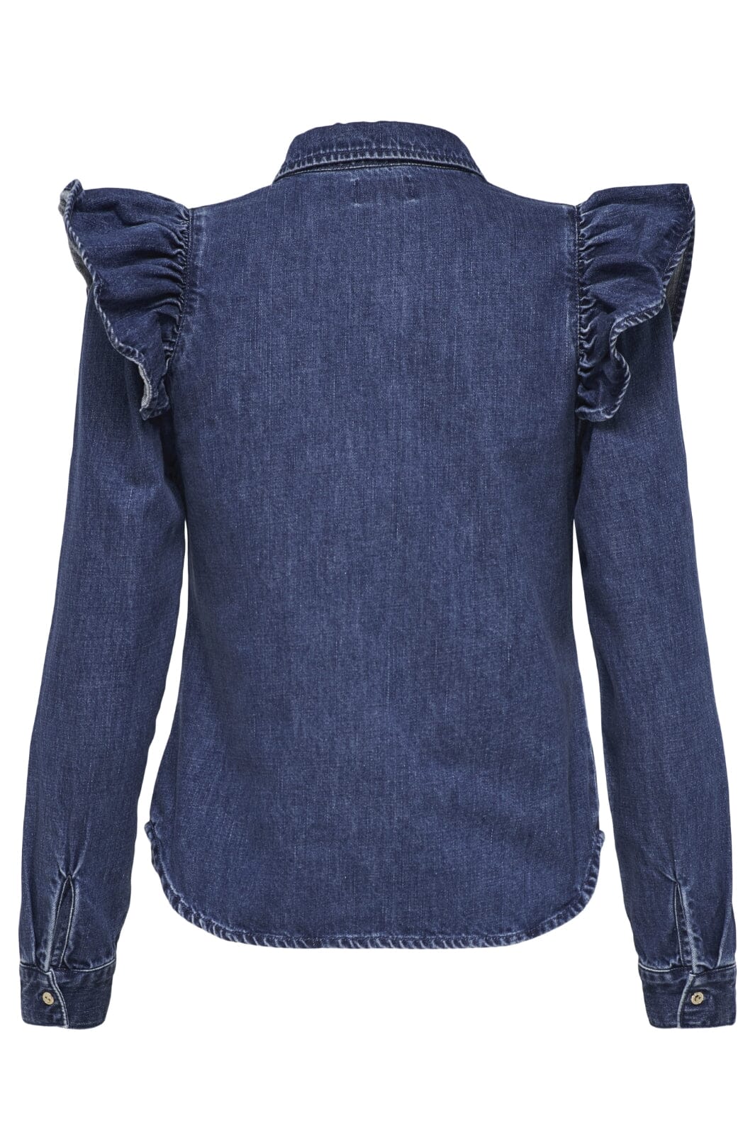 Mørkeblå denimskjorte fra Only med store volangdetaljer på brystet. Skjorten har en avslappet passform, skjortekrage og lange ermer med knapper ved mansjettene.