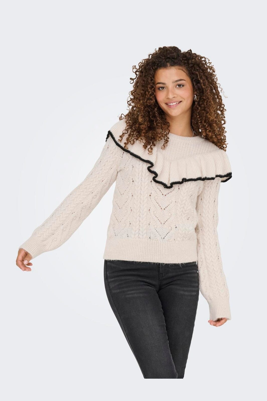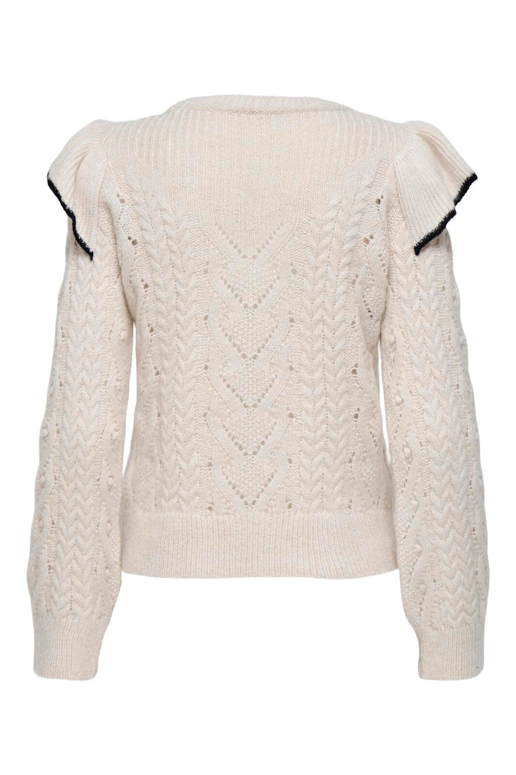 Strikkegenser fra Only i en lys bjørk-svart nyanse. Den har en rund halsutskjæring med volangdetalj og svart kant, lange ermer og et kabelstrikket mønster over hele genseren.