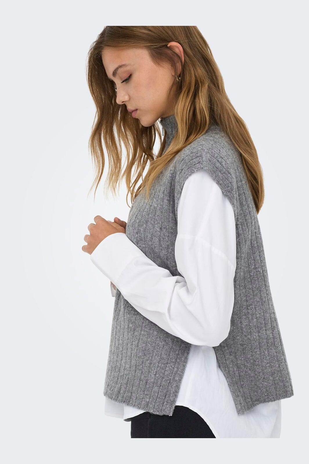 Ermeløs strikkevest fra ONLY i gråmelert. Vesten har høy hals med glidelås og en ribbet tekstur.