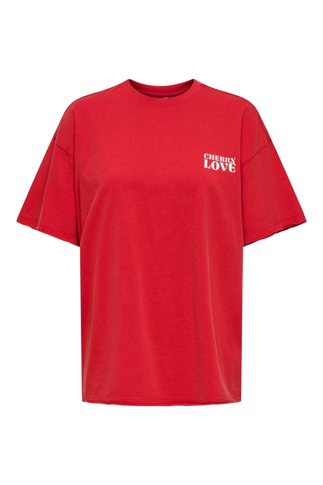 Rød oversized T-skjorte fra Only, laget av 100 % økologisk bomull. T-skjorten har kirsebærtrykk og tekst på brystet og ryggen.
