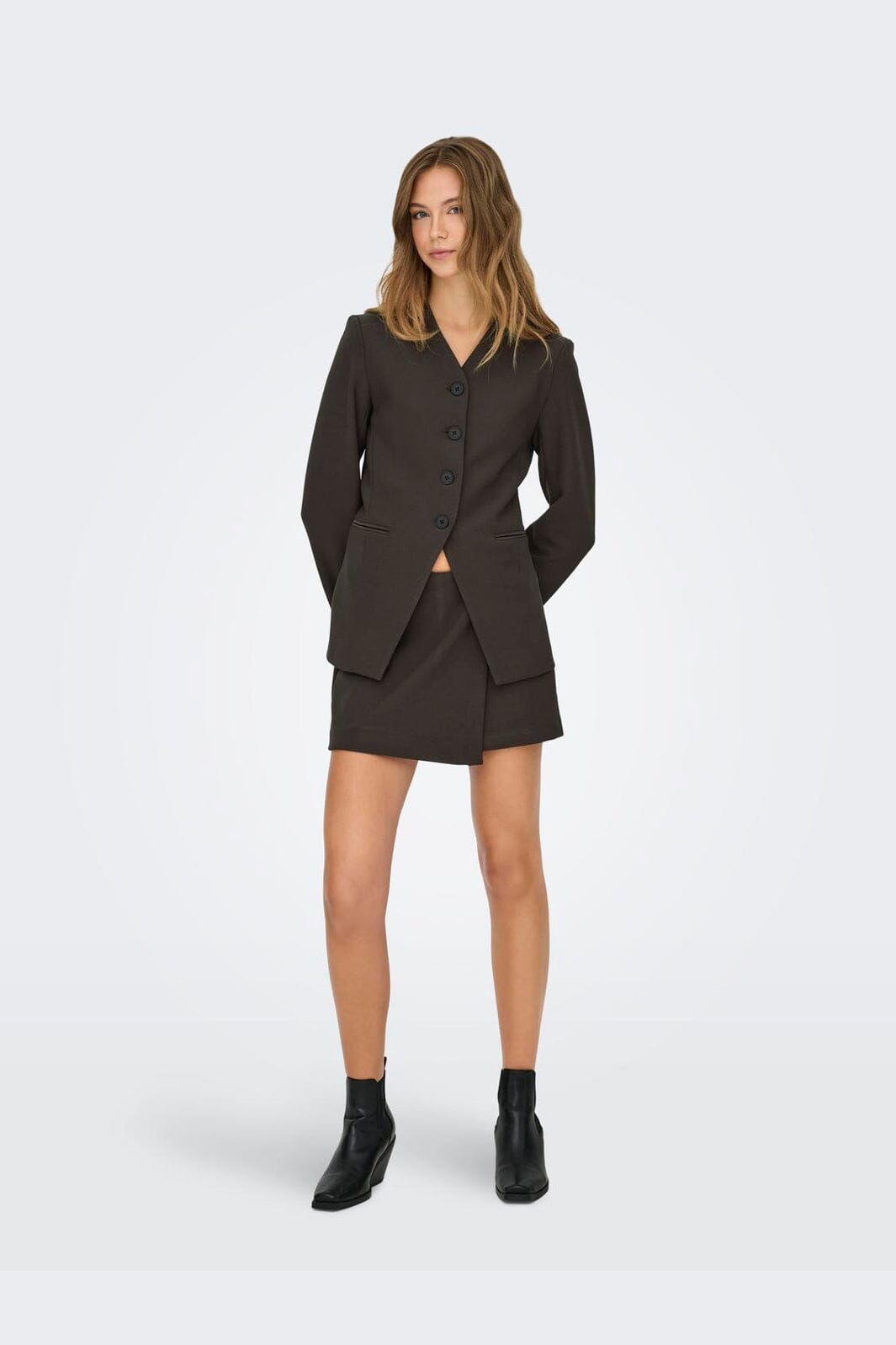 Mørkebrun skort fra Only med asymmetrisk overlapp foran. Skorten har en middels høy midje og lårkort lengde.