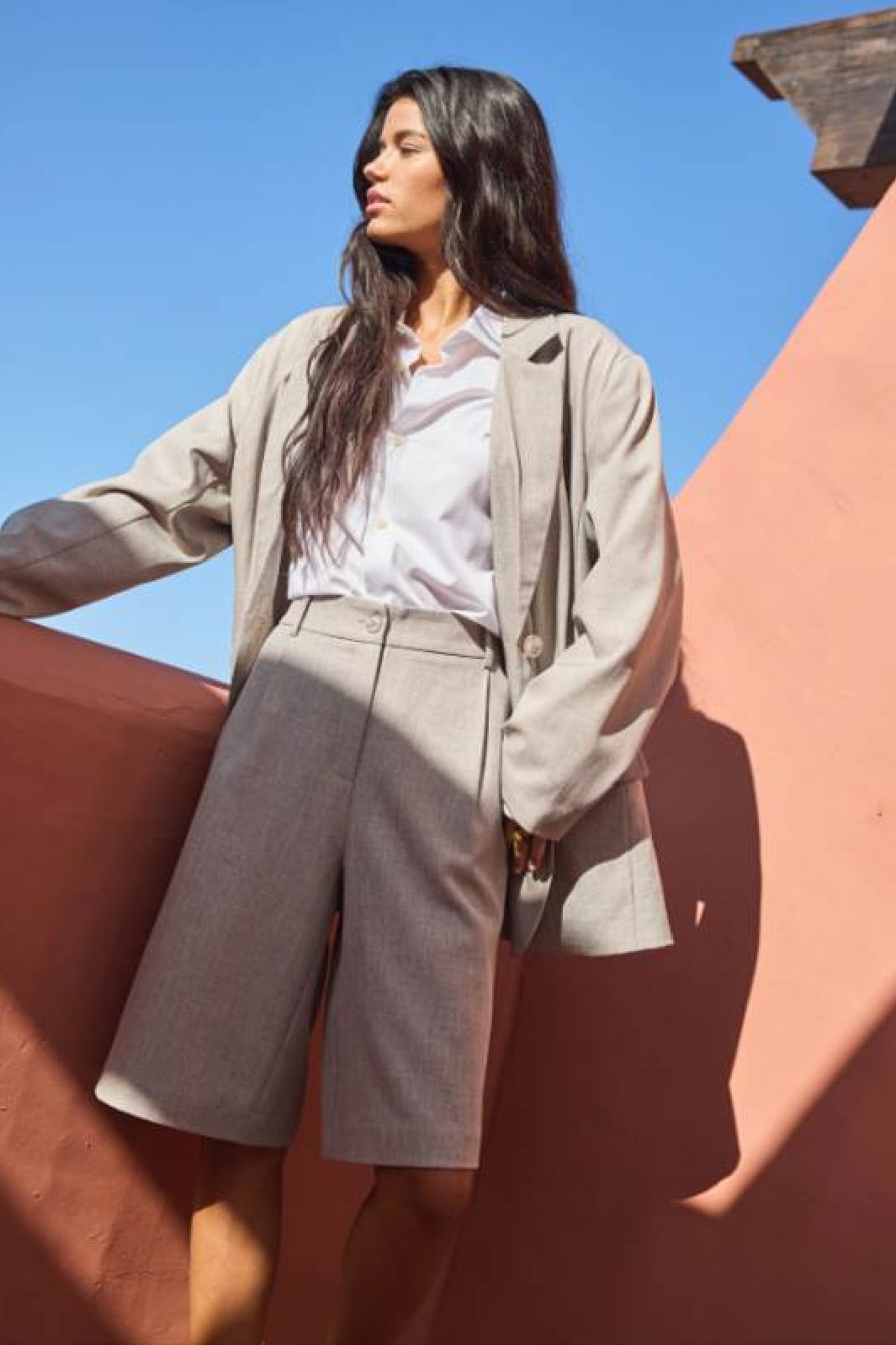 Knelange bermudashorts i lys grå melange med høy midje og loose fit. Shortsen har legg foran og praktiske sidelommer samt beltestropper.