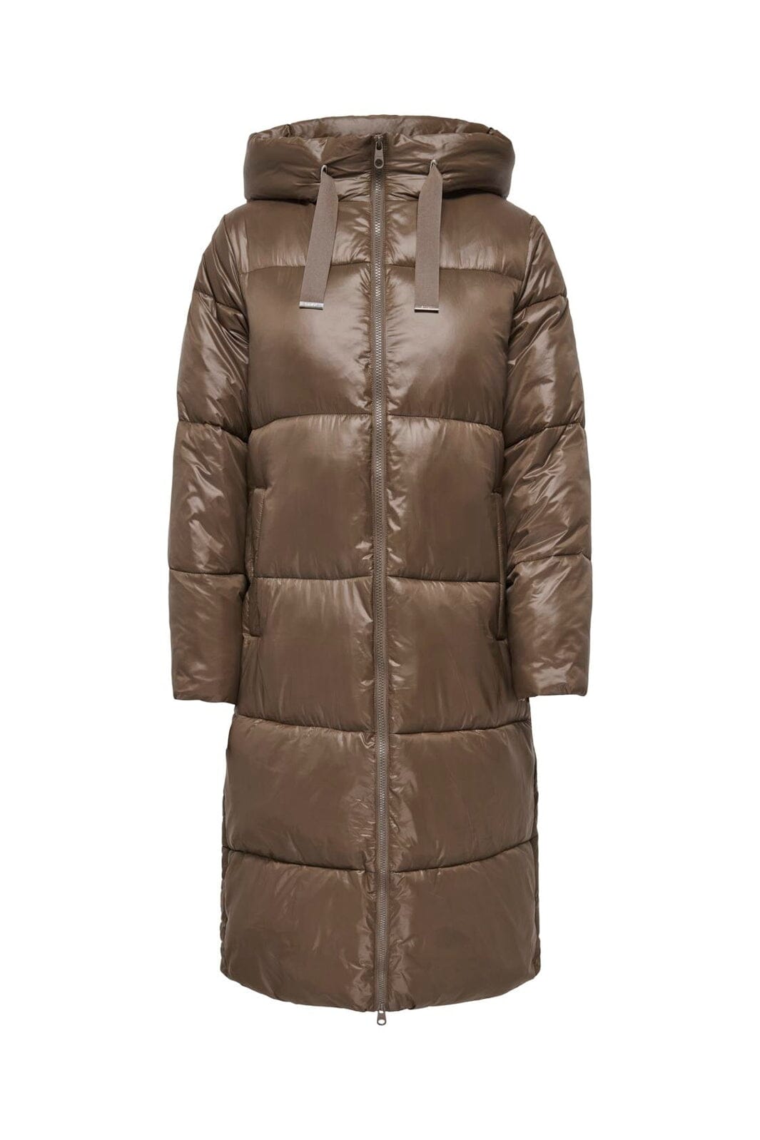 Lang pufferjakke fra Only i brun farge. Jakken er laget av 100 % nylon og har hette med snor.