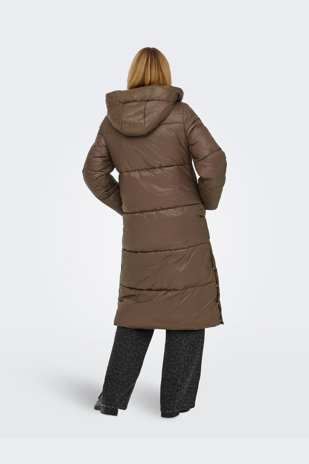 Lang pufferjakke fra Only i brun farge. Jakken er laget av 100 % nylon og har en hette med snor.