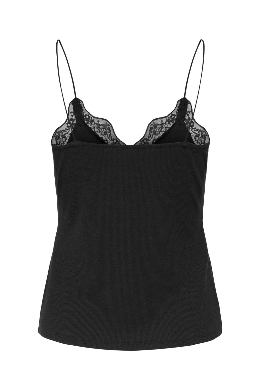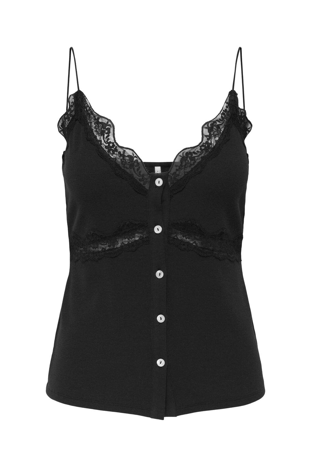 Svart singlet fra Only med blondekant og knappelukking. Toppen har en V-halsutskjæring og tynne stropper, som gir en slim fit-passform.