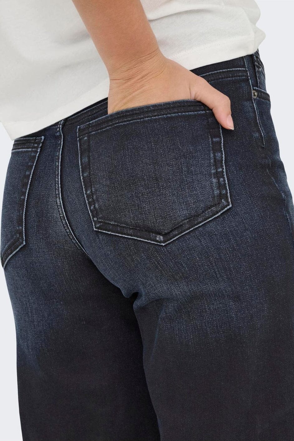 Mørkeblå jeans fra Only med høy midje og løs passform. Jeansene har vide ben fra hofte til ankel og ankellengde.