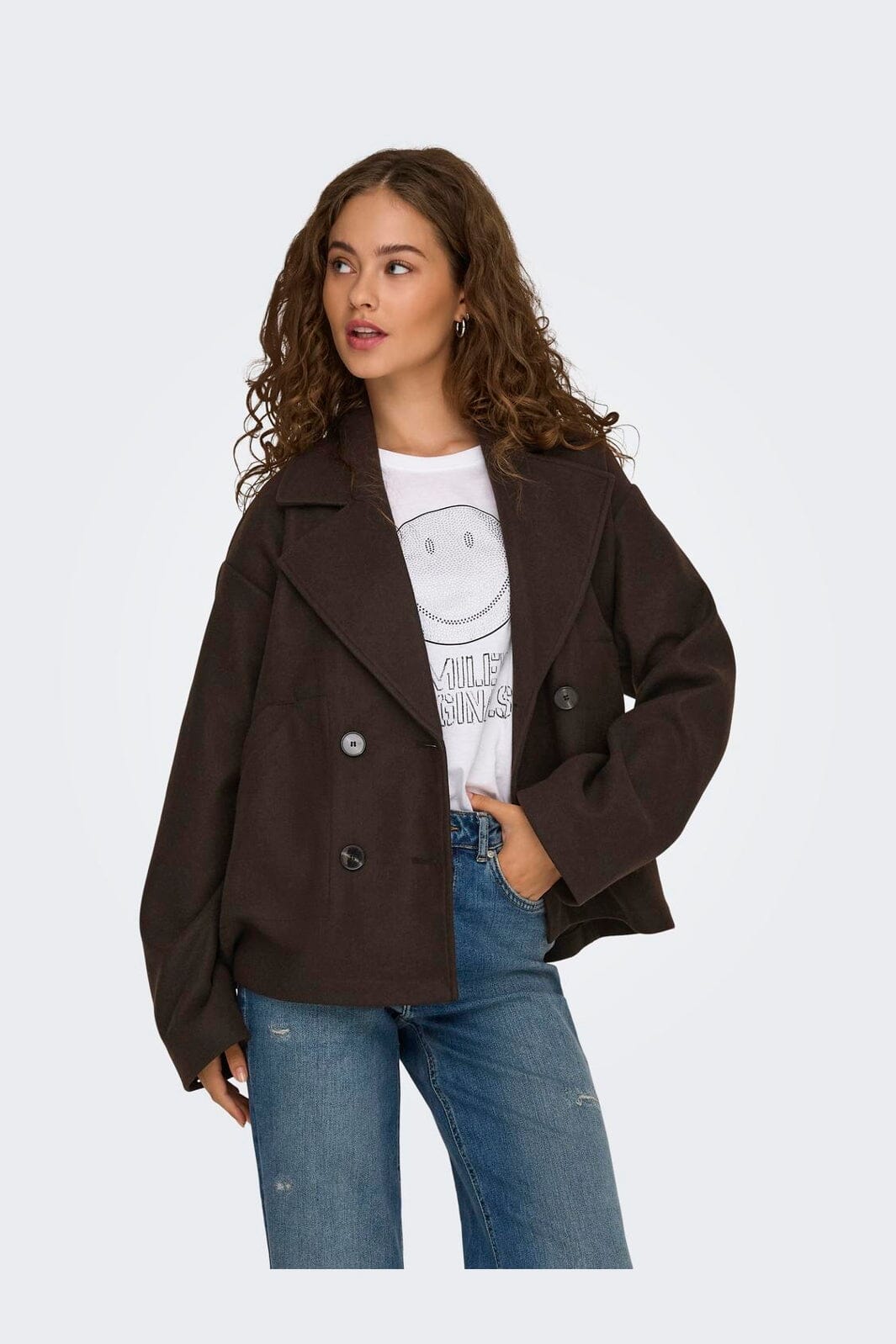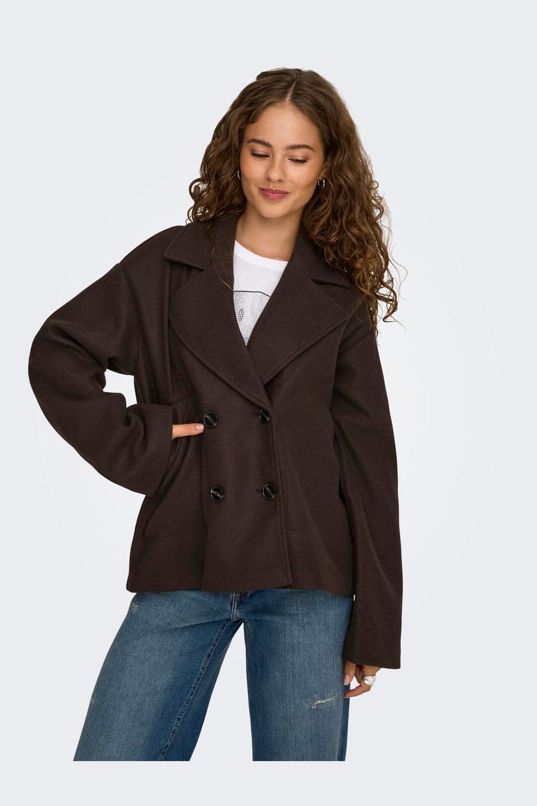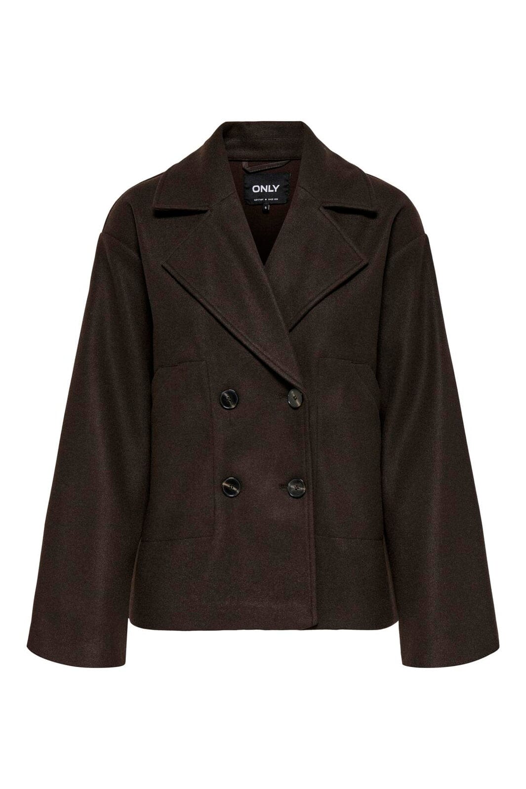 Mørkebrun jakke fra Only med dobbeltknappet lukking. Den har en bred krage og lange ermer, som gir god dekning. Sidelommene gjør jakken praktisk til hverdagsbruk.