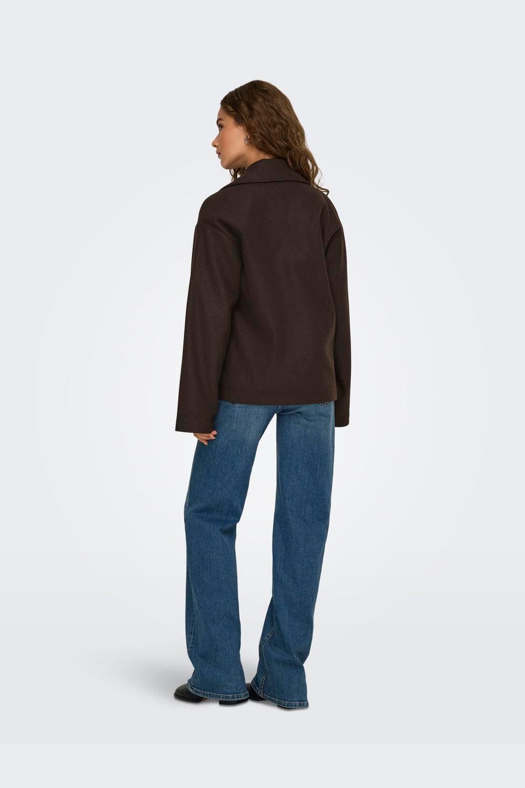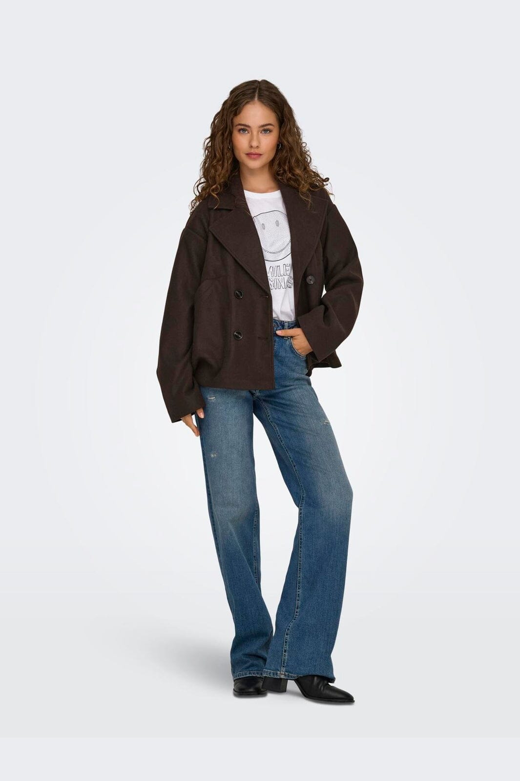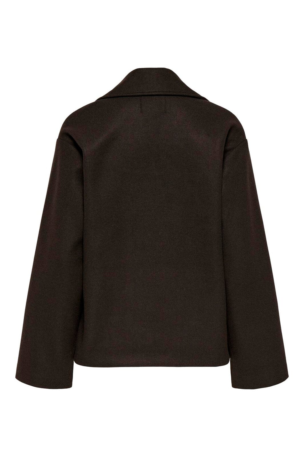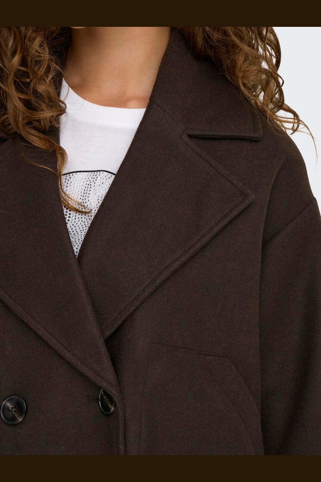 Mørkebrun jakke fra Only med dobbeltknappet lukking. Den har en bred krage og lange ermer, som gir god dekning. Sidelommene gjør jakken praktisk til hverdagsbruk.