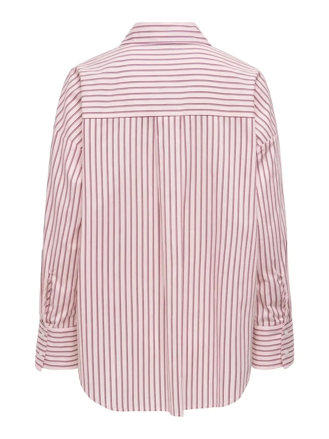 En stripete skjorte fra Only med lyserosa og bordeaux striper på hvit bakgrunn. Skjorten har knappelukking, lange ermer og en klassisk skjortekrage.