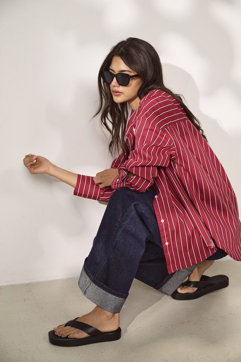 Stripete skjorte fra Only, laget av 100 % økologisk bomull. Den har et hvitt stripemønster på en dyp bordeauxrød bakgrunn.