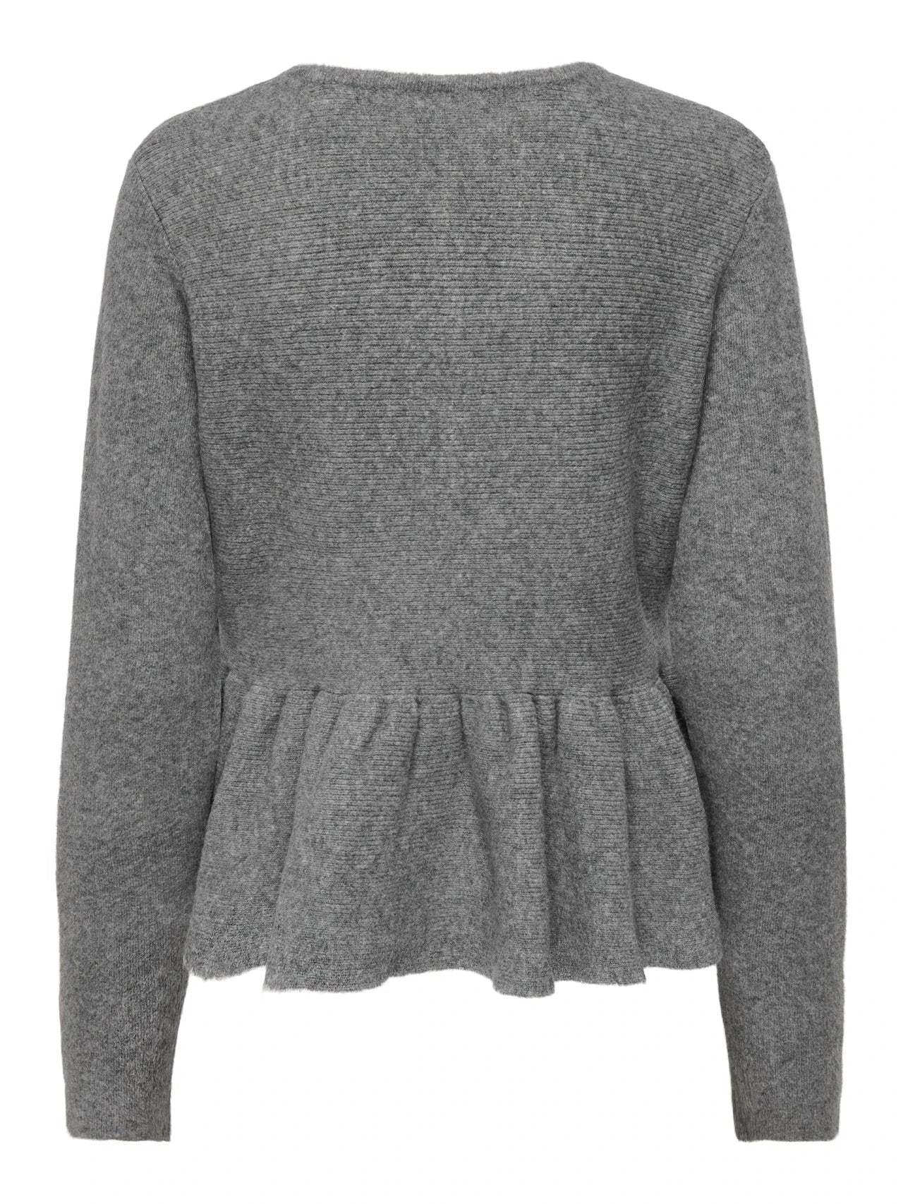Lys grå cardigan fra Only med peplum-detalj i midjen. Cardiganen har knappelukking foran, lange ermer og en rund halsutringning.
