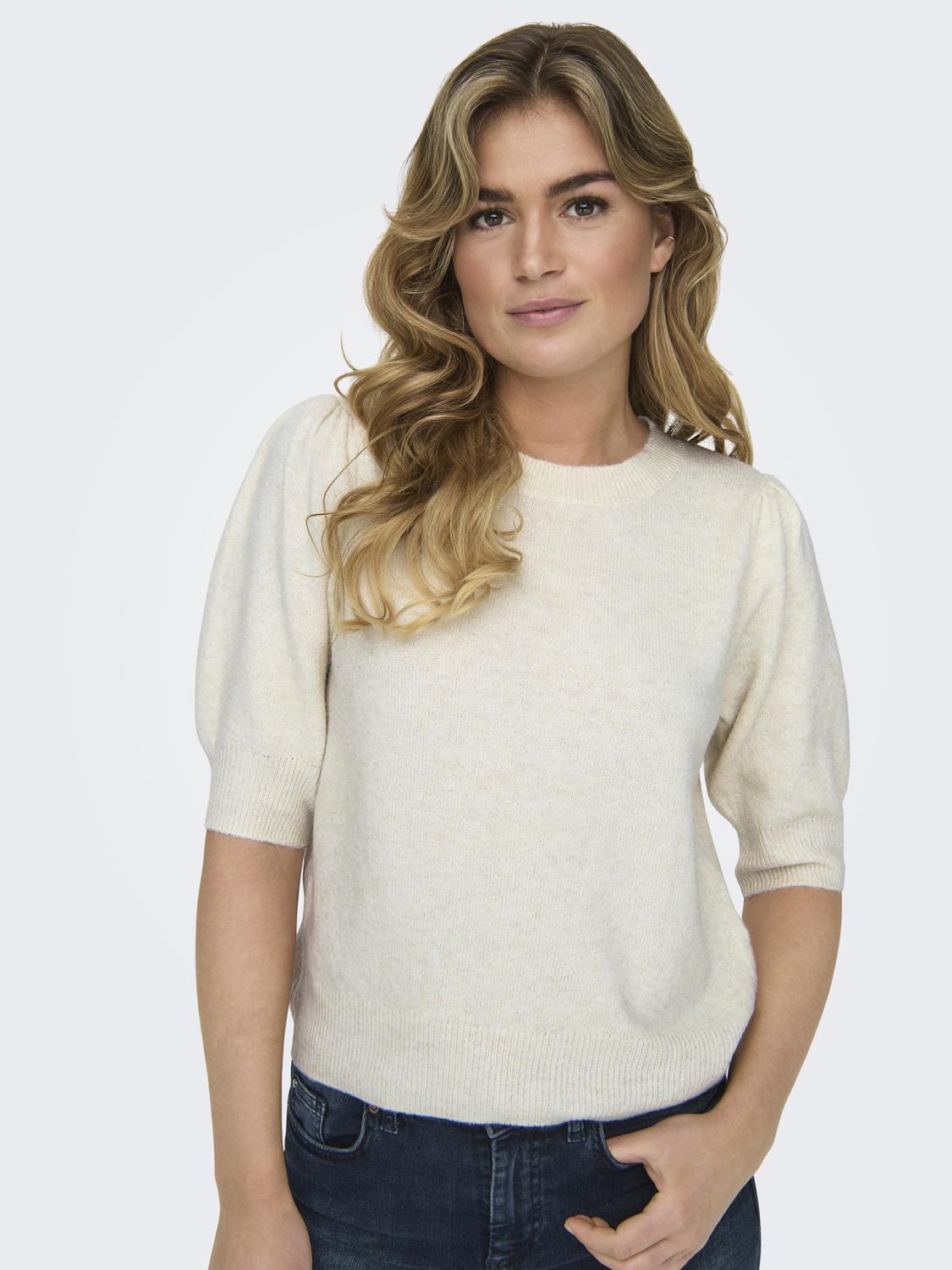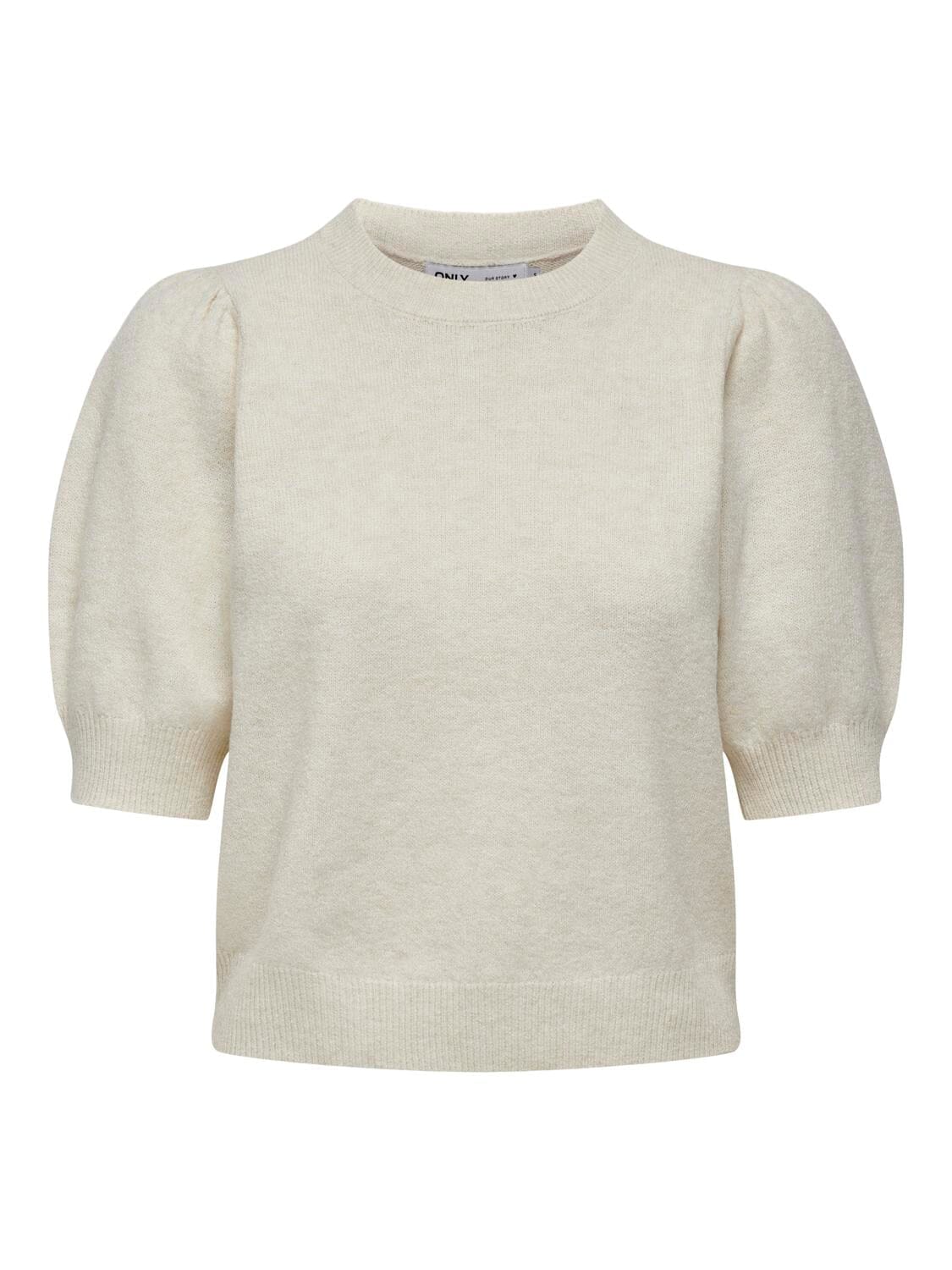 Kremfarget strikkegenser fra Only med kort lengde og pufferm. Genseren har rund halsutringning og ribbestrikkede kanter ved ermene og nederst.