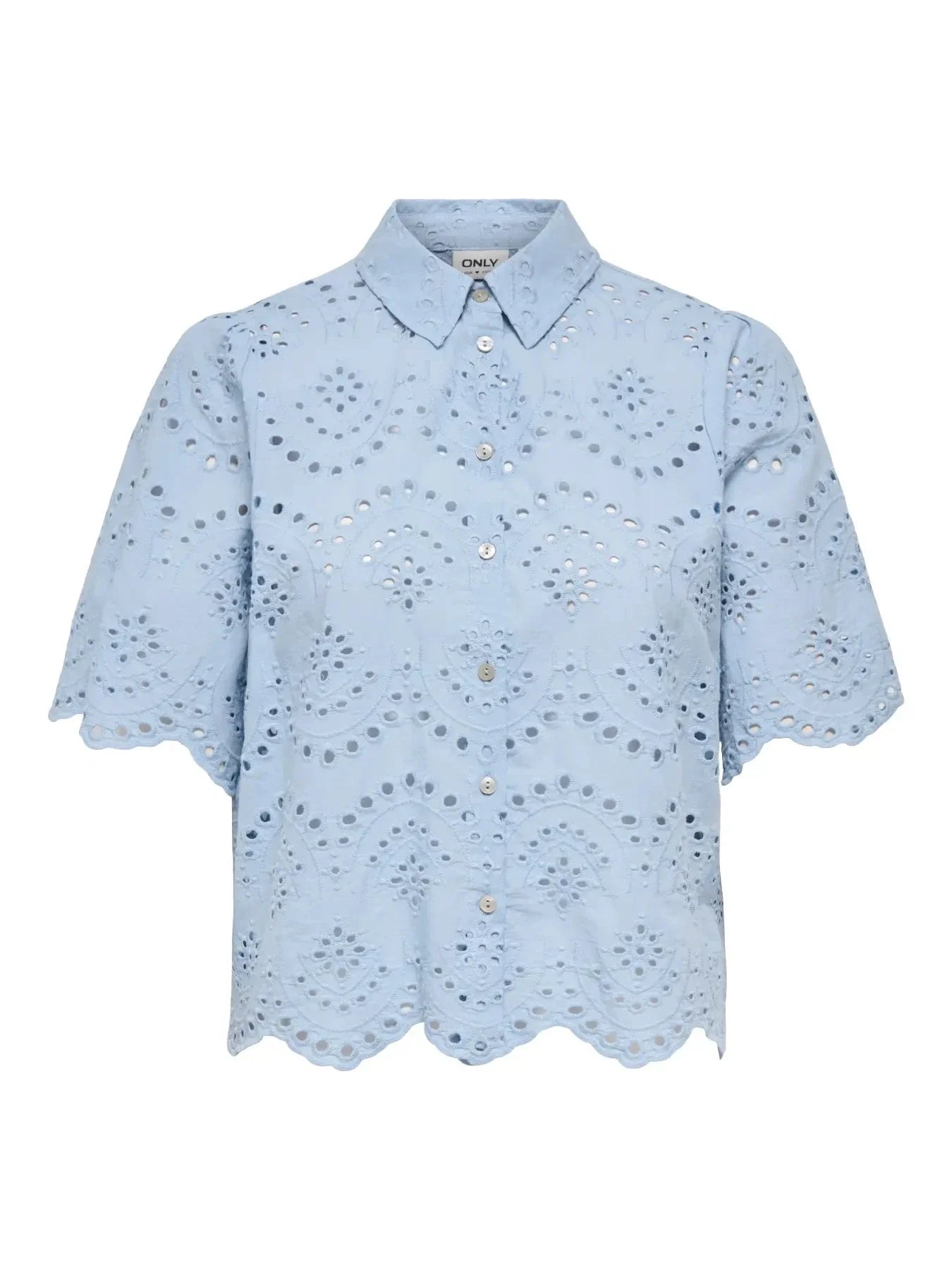 En kortermet skjorte fra Only i lyseblå bomull. Skjorten har broderte hullmønstre, knappelukking foran og en bølget kant ved ermene og nederst.
