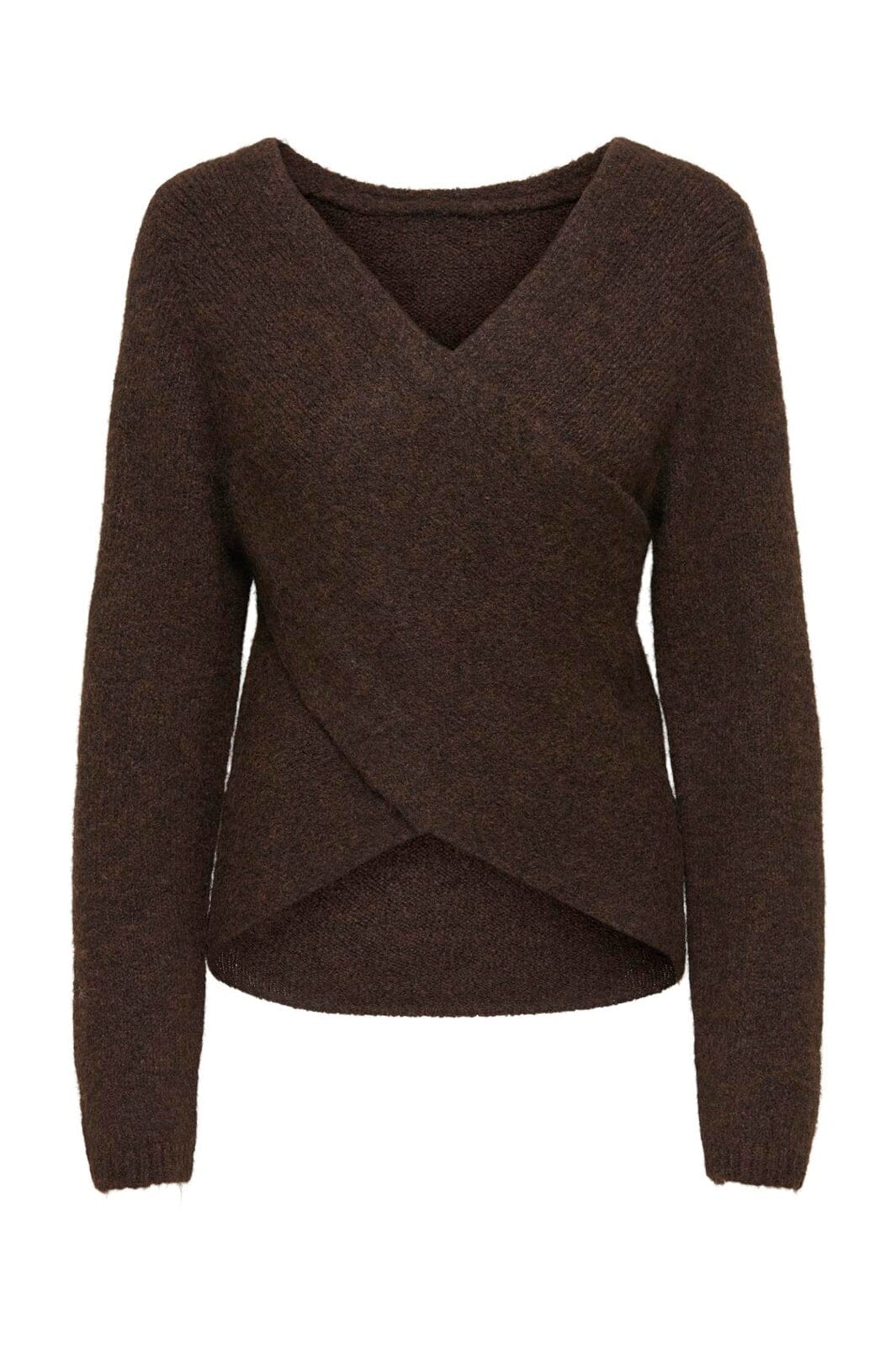 Vendbar strikkegenser fra Only i mørkebrun farge. Genseren har en V-halsdesign på den ene siden og en rund hals på den andre.