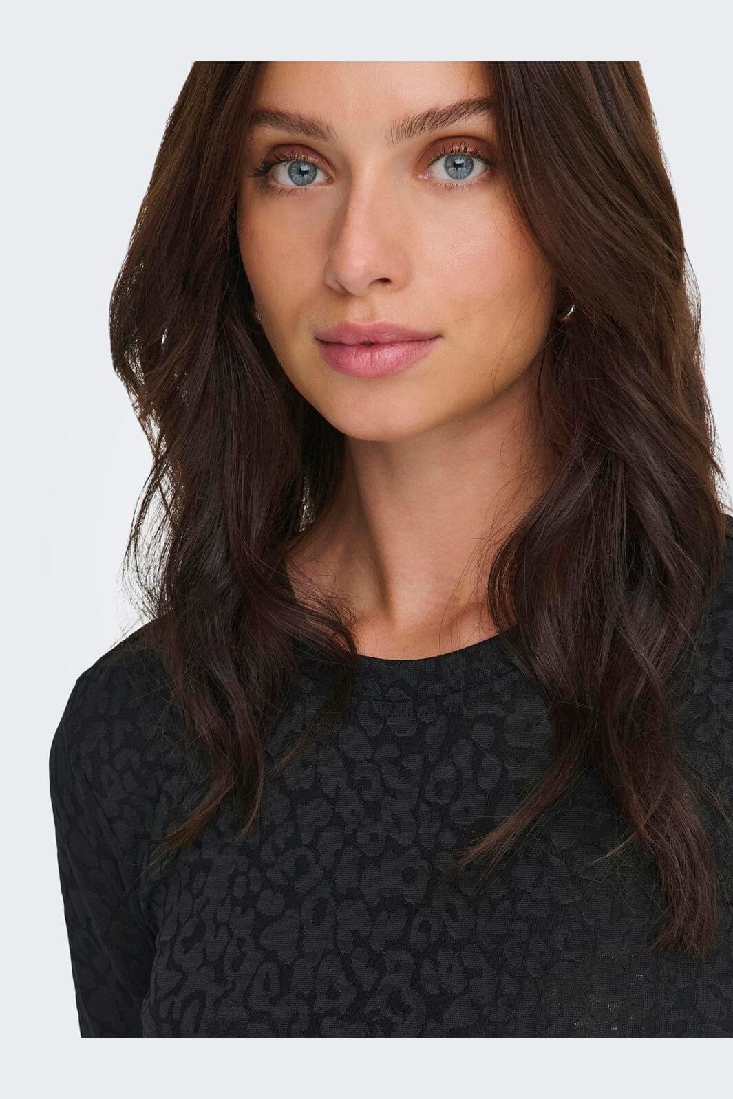 Svart langermet topp fra Only med rund hals og leopardmønster. Toppen har en kroppsnær passform og er laget i en myk kvalitet med stretch, noe som gjør den behagelig å ha på.