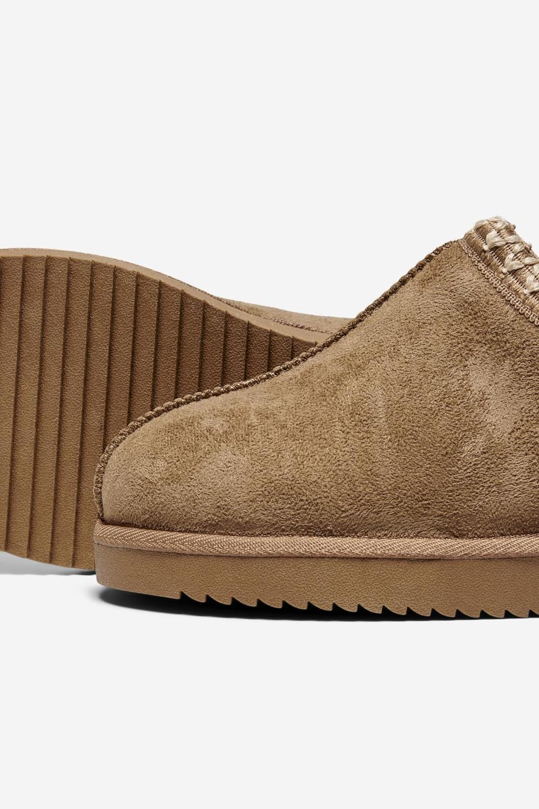 Innesko fra Only i cognacfarget syntetisk semsket skinn. Den myke skoen har et varmt teddyfôr og dekorative sømmer langs kanten.