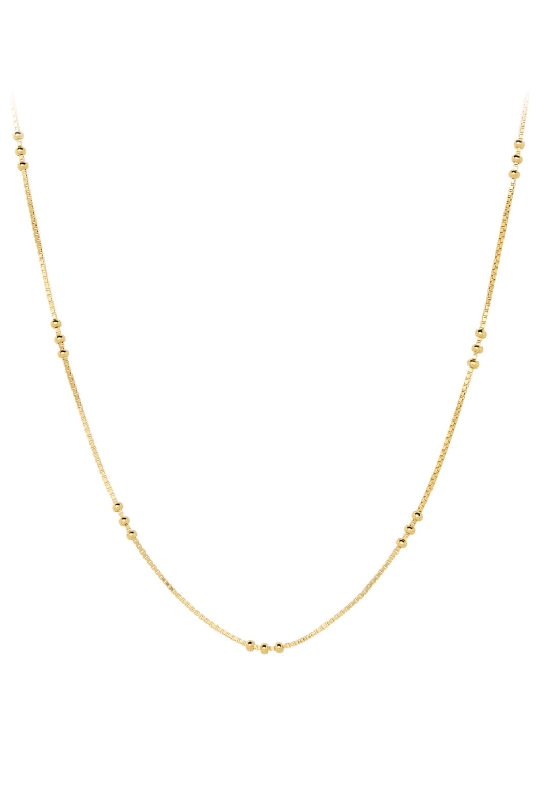 Gyldent halskjede fra Pernille Corydon Jewellery med en fin veksling mellom små perler og flate seksjoner langs kjeden. Smykket er laget av gullbelagt sterling sølv.