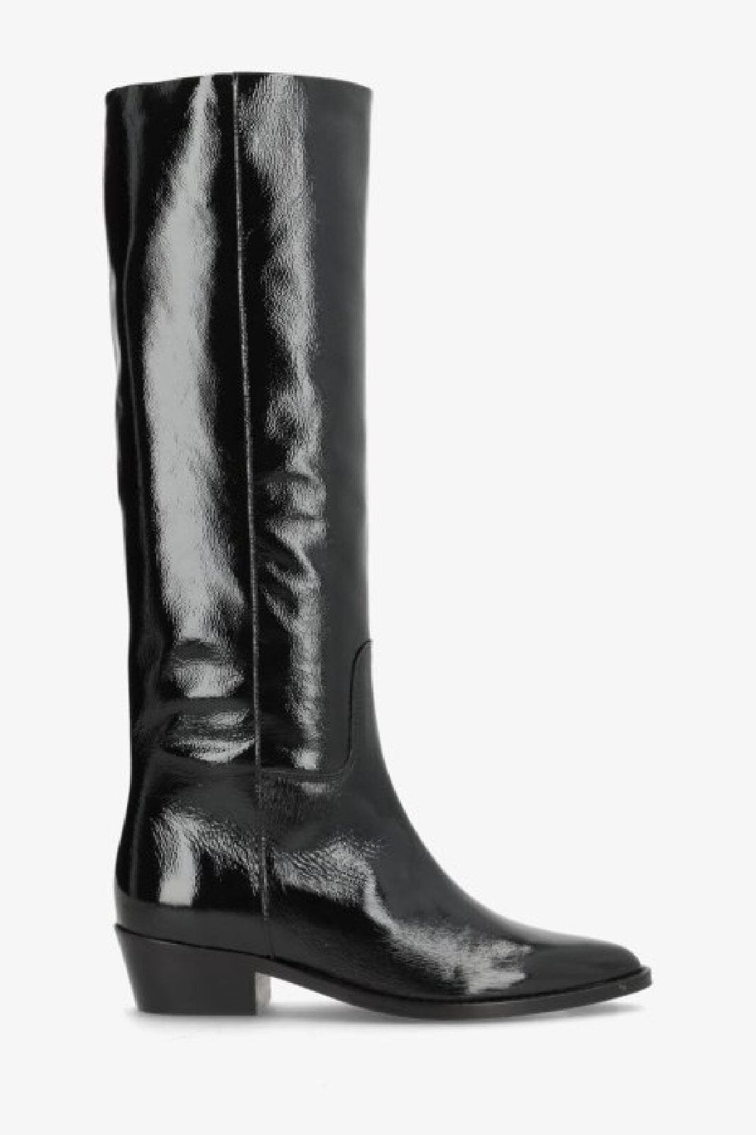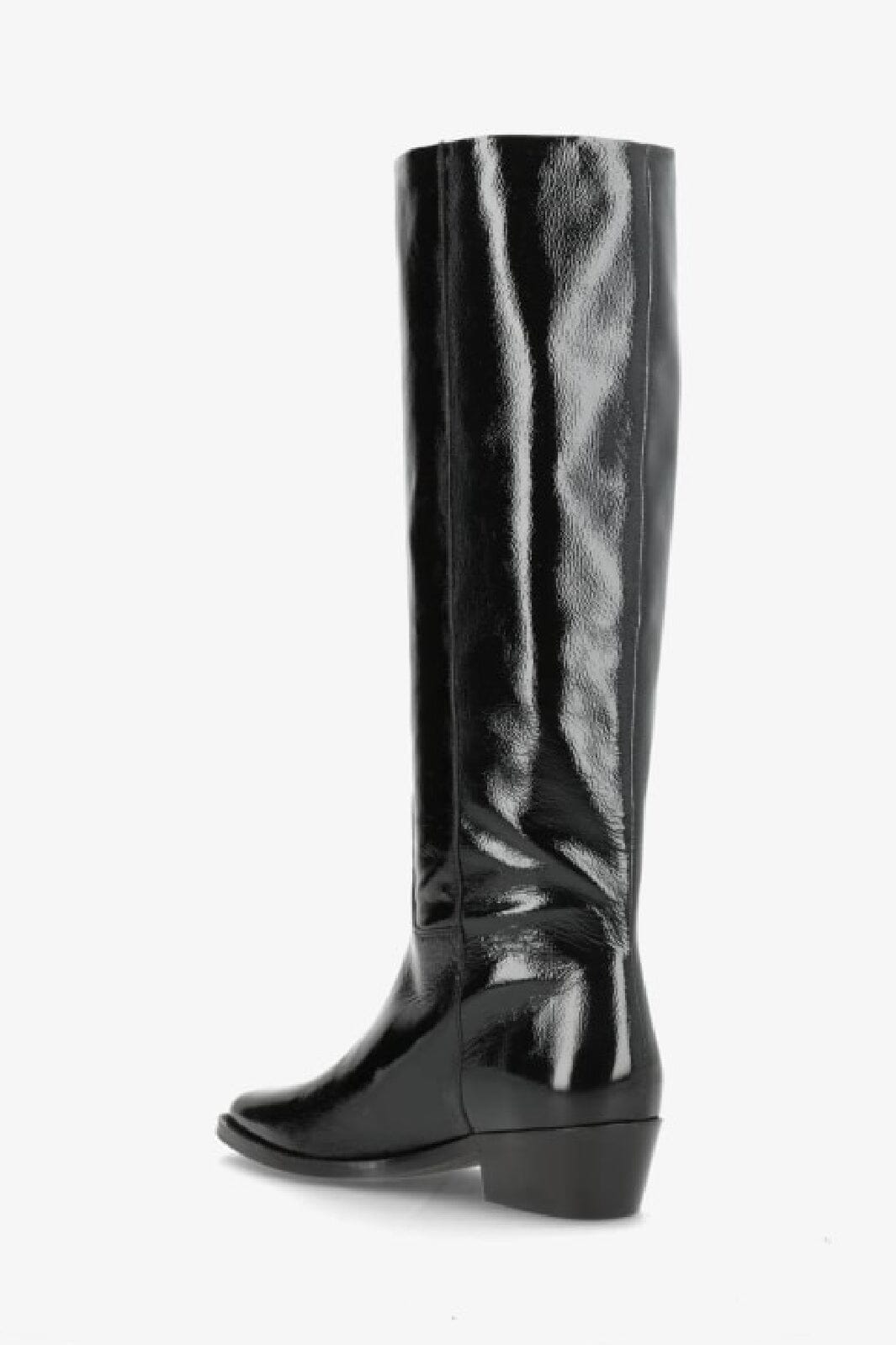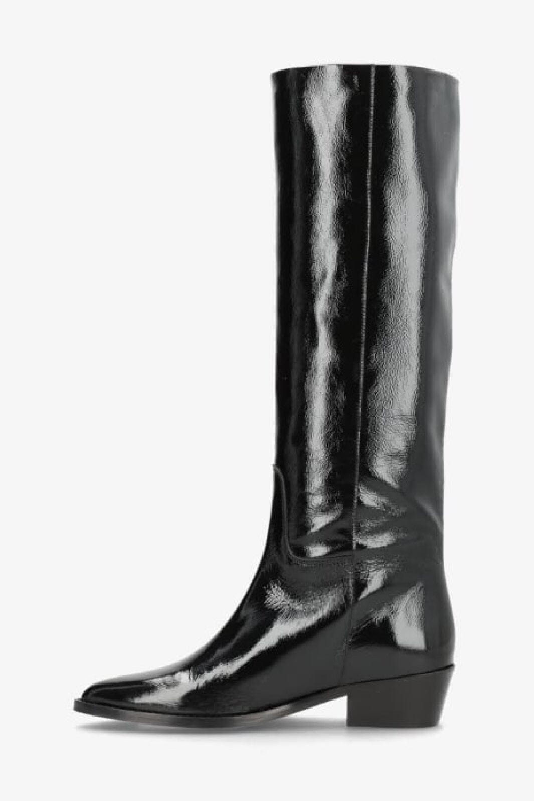 Sorte knæhøye støvler i patentlær med spiss tå fra Phenumb Copenhagen. Støvlene har en blank overflate og en blokkhæl på 5-8 cm.