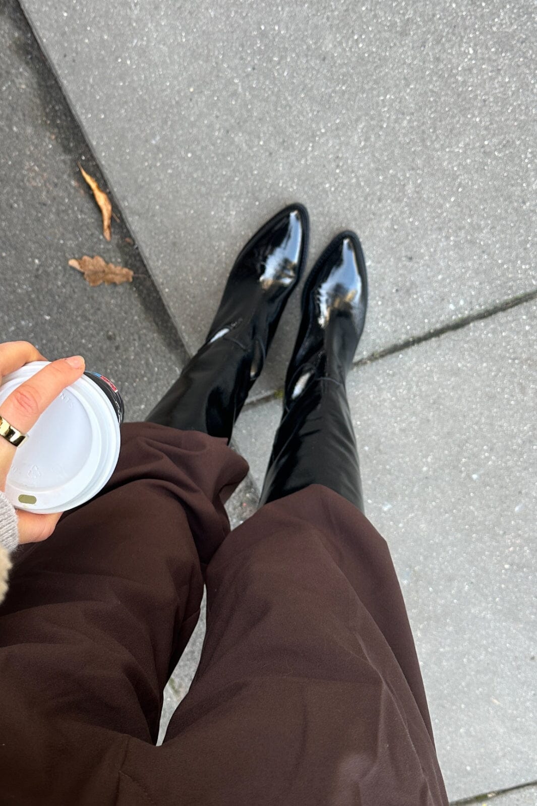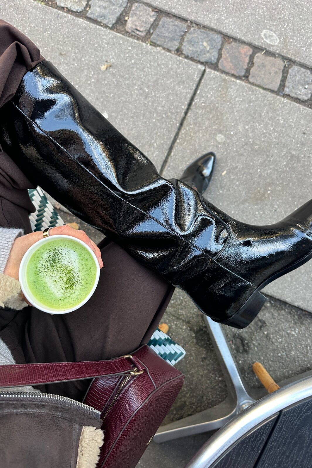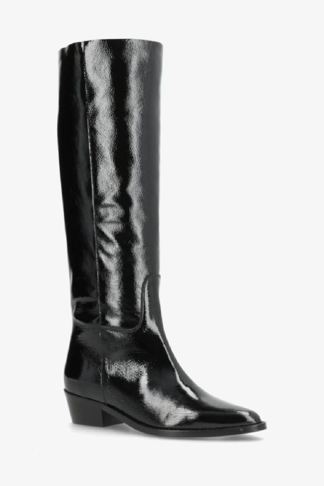 Sorte knæhøye støvler i patentlær med spiss tå fra Phenumb Copenhagen. Støvlene har en blank overflate og en blokkhæl på 5-8 cm.