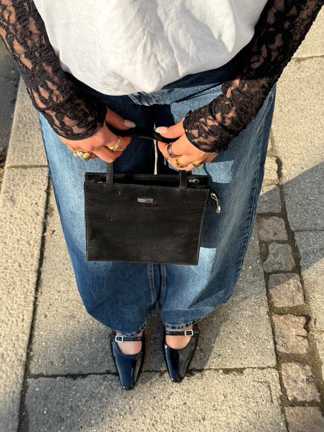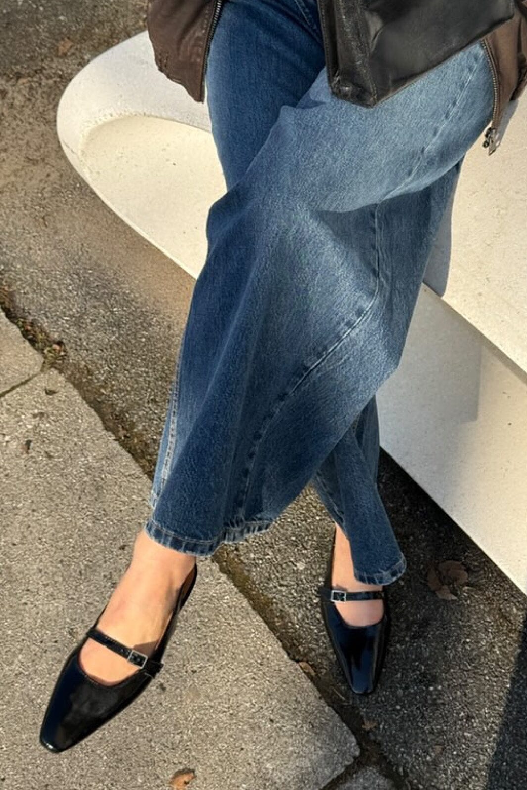 Svart ballerina-sko fra Phenumb Copenhagen i lakkert lær. Den spisse tåen og remmen med spenne gir skoen et rent design som passer til både hverdag og fest.